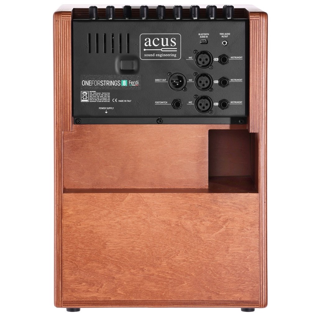 Acus One ForStrings 8 Ferdi Wood je trojkanálové akustické kombo z radu Ferdi s novým rozhraním/systémom Ferdi-UXLogic, výkonom 140 wattov a dvoma vstupmi (mikrofónnym a nástrojovým) na každom kanáli. Každý kanál má k dispozícii samostatný trojpásmový ekvalizér, ovládač hlasitosti, gainu (-12 až +15 dB) a úrovne zvoleného zabudovaného efektu. Prvý kanál navyše ponúka sekciu kompresora a trojpolohový prepínač, ktorý mení charakter EQ podľa zvoleného typu nástroja (Flat - lineárna odozva, rovnaké EQ ako kanály 2 a 3, Bass - pre nástroje s bohatými basmi ako predstavuje akustická basgitara alebo kontrabas, Jazz - ideálny pre lubové/jazzové gitary). Efektová sekcia ponúka štyri typy efektov (Short Reverb, Long Reverb, Chorus, Delay) a možnosť nastavenia dĺžky reverbu, rýchlosti chorusu a delay time. Samostatnou kapitolou je Aux kanál s konektormi Bluetooth audio in a TRRS audio in/out, vďaka ktorým vám Acus One ForStrings 8 umožní počúvať a hrať do vašej obľúbenej hudby z telefónu, MP3 prehrávača alebo notebooku, nahrávať a živo streamovať na populárnych sociálnych platformách. Kombo tiež ponúka možnosť zapojenia kondenzátorových mikrofónov vďaka voliteľnému fantómovému napájaniu, symetrický XLR Direct Out výstup pre prepojenie kombá s mixom alebo PA a vstup pre footswitch (nie je súčasťou balenia), cez ktorý je možné zapínať/vypínať zvolený efekt. Na napájanie samotného kombá použite pribalený adaptér. Konštrukcia kombá je zhotovená z preglejky, kabinet je osadený osempalcovým wooferom a palcovým tweeterom. Frekvenčný rozsah kombá zodpovedá 40Hz-20KHz, citlivosť 89,6 dB a maximálny akustický tlak 109dB. Súčasťou balenia je napájací adaptér a Bluetooth prijímač Artesia BT-1. Spoločnosť Acus bola založená pred 40 rokmi v talianskom meste Recanati. Jej majitelia sa od samého začiatku zameriavali na akustické zosilňovače a kombá, ktoré by akustickým nástrojom neuberali nič na ich prirodzenom zvuku a iba ich jasne a čisto zosilneli. Všetky ich produkty sú navrhované s maximálnou starostlivosťou a ich cieľom je vždy produkovať čistý, takmer štúdiový zvuk. Nezanedbateľnú súčasť samozrejme tvorí dizajn ich výrobkov, a preto mu firma Acus venuje enormnú starostlivosť. Tým perfektne plní svoj cieľ akustickej aj vizuálnej harmónie.