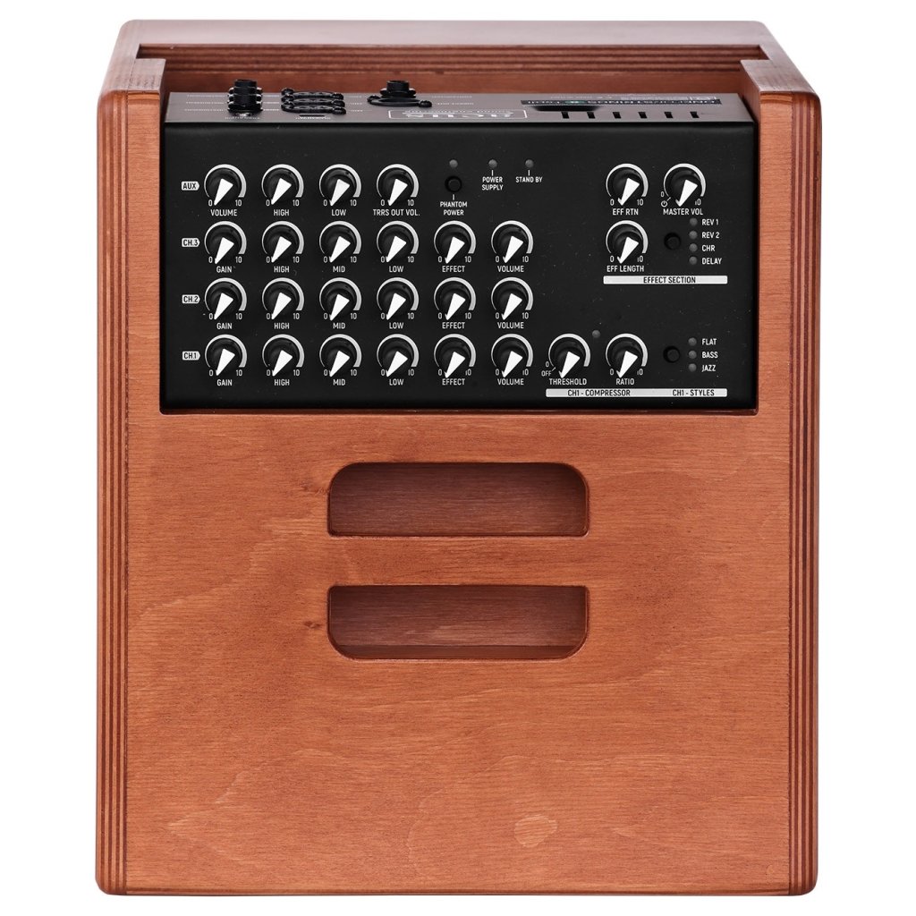 - Ovládanie : 4x Volume, 3x Gain, 4 xHigh, 4 x Low, 3x Mid, 3x Effect, TRRS Out Volume, Threshold (Comp), Ration (Comp), Eff Return, Eff Lenght, Master Volume, Eff switch (Rev1, Rev2, CHR, Dly), Styles switch (Flat, Bass, Jazz), Phantom Power switch