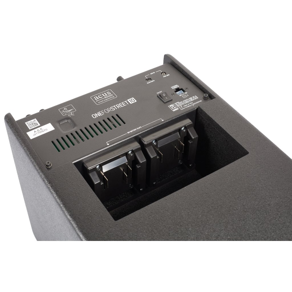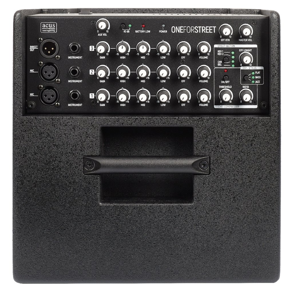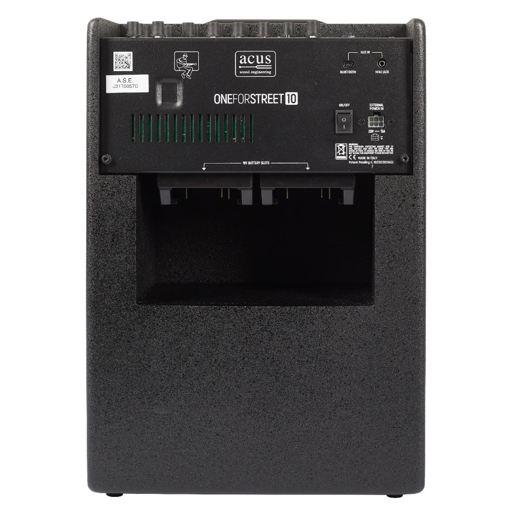ONEFORSTREET 10 BLK je akustické nástrojové kombo vhodné pre pouličných hudobníkov/buskerov a menšie hudobné skupiny. Je vybavený prepracovaným dizajnom Acus, tromi kanálmi s tromi nástrojovými vstupmi a dvoma mikrofónovými vstupmi, efektovým procesorom s efektmi reverb, chorus a delay, vstavaným kompresorom (len na prvom kanáli), pokročilými funkciami (kompatibilita s Bluetooth prostredníctvom dodávaného prijímača Artesia BT-1, streamovanie pripojením výstupu XLR Direct Out a konektora Aux In) a napájaním z batérie s výdržou až sedem hodín na jedno nabitie.