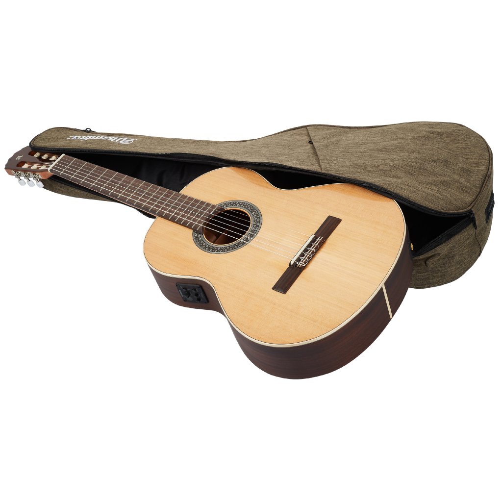 Predná doska nástroja Alhambra 1 C HT EZ vo veľkosti 4/4 je vyrobená z masívneho červeného cédra, zatiaľ čo zadná doska a luby sú z dyhovaného mahagónu. K ergonomicky tvarovanému mahagónovému krku je prilepený palisandrový hmatník osadený pražcami pakfong/alpaka. Struny sú uložené v poniklovaných ladiacich mechanikách a palisandrovom hmatníku prostredníctvom syntetického nultého a sedlového pražca. Pekné spracovanie podčiarkuje javorové lemovanie tela a logo spoločnosti na hlavici.