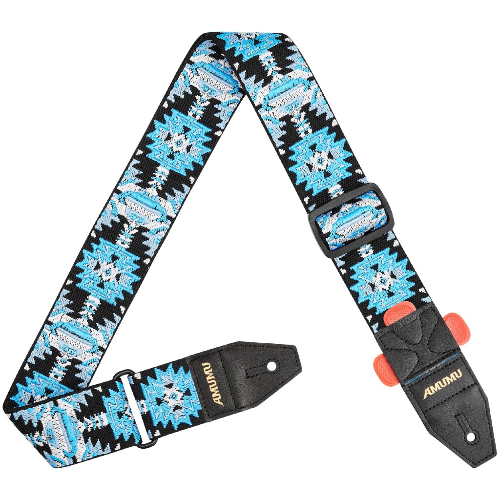 Kytarové popruhy značky AMUMU jsou známé svou odolností, spolehlivostí a kvalitou provedení. Díky široké nabídce modelů a barev si mezi nimi vybere opravdu každý. Popruh Blue Aztec Starburst na první pohled zaujme unikátním barevným designem. Vyroben je z odolné prošívané tkaniny, která vám zajistí vysokou pevnost a dokonalé pohodlí. Kvalitní koncovky z pravé kůže se pak postarají o spolehlivé uchycení k nástroji a dlouhou životnost. Pro větší praktičnost je jedna z koncovek navíc vybavena třemi držáky na trsátka, které vám přijdou vhod, když uprostřed koncertu nebo cvičení omylem upustíte trsátko.