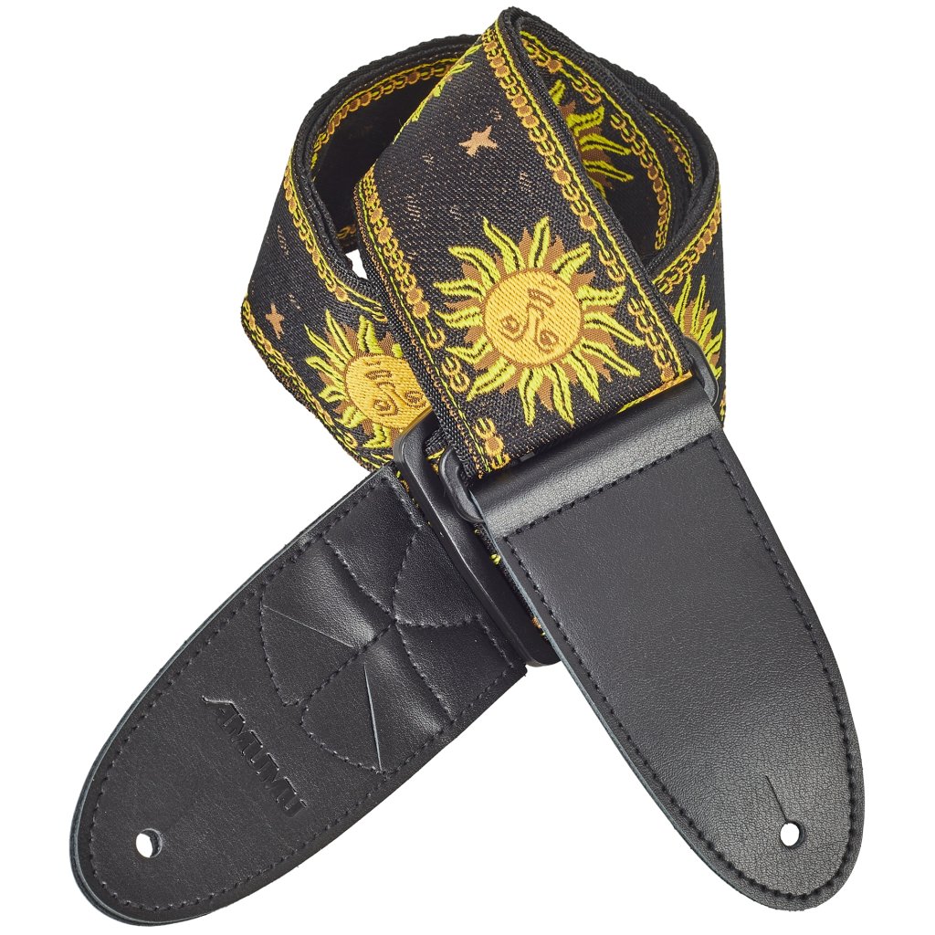Jacquard Sun Strap Black je popruh vyrobený z odolného nylonu na zadní straně a z polyesteru na straně přední. Délka je nastavitelná a hodí se pro většinu hráčů. Zároveň je díky tomu možné použít tento popruh, kromě kytary a baskytary, například na ukulele nebo mandolínu. Konce jsou z kůže pro kvalitní uchycení nástroje a přední konec disponuje třemi kapsami na trsátka (tři trsátka najdete v balení). Součástí balení je také tkanice pro případ, že by váš nástroj osazen pouze jednou rolnou a gumové zámky, které zabraňují nežádoucímu vyvléknutí. Zdobený je vyšívaným sluncem.