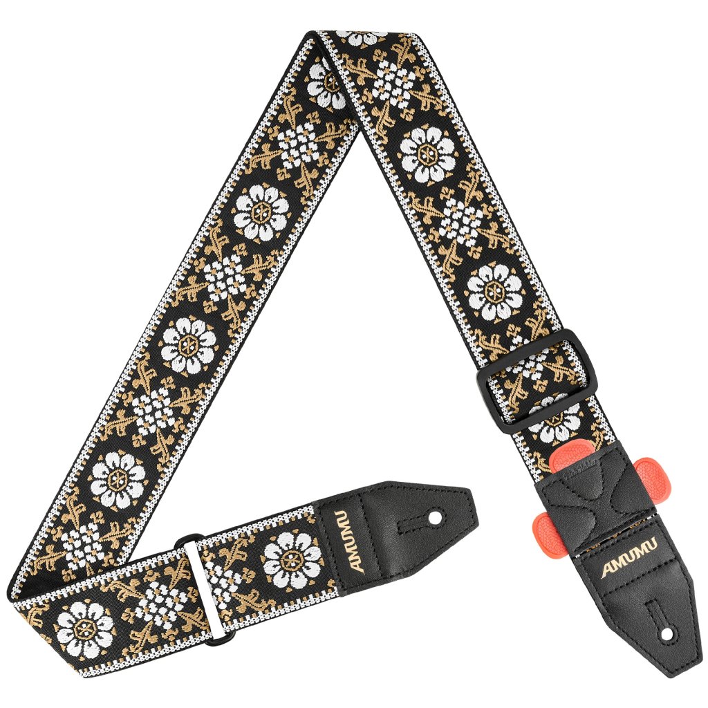 Kytarové popruhy značky AMUMU jsou známé svou odolností, spolehlivostí a kvalitou provedení. Díky široké nabídce modelů a barev si mezi nimi vybere opravdu každý. Popruh Lucky Flower Yellow White na první pohled zaujme unikátním prošívaným retro designem. Vyroben je z odolné bavlněné tkaniny, která vám zajistí vysokou pevnost a dokonalé pohodlí. Kvalitní koncovky z pravé kůže se pak postarají o spolehlivé uchycení k nástroji a dlouhou životnost. Pro větší praktičnost je jedna z koncovek navíc vybavena třemi držáky na trsátka, které vám přijdou vhod, když uprostřed koncertu nebo cvičení omylem upustíte trsátko.