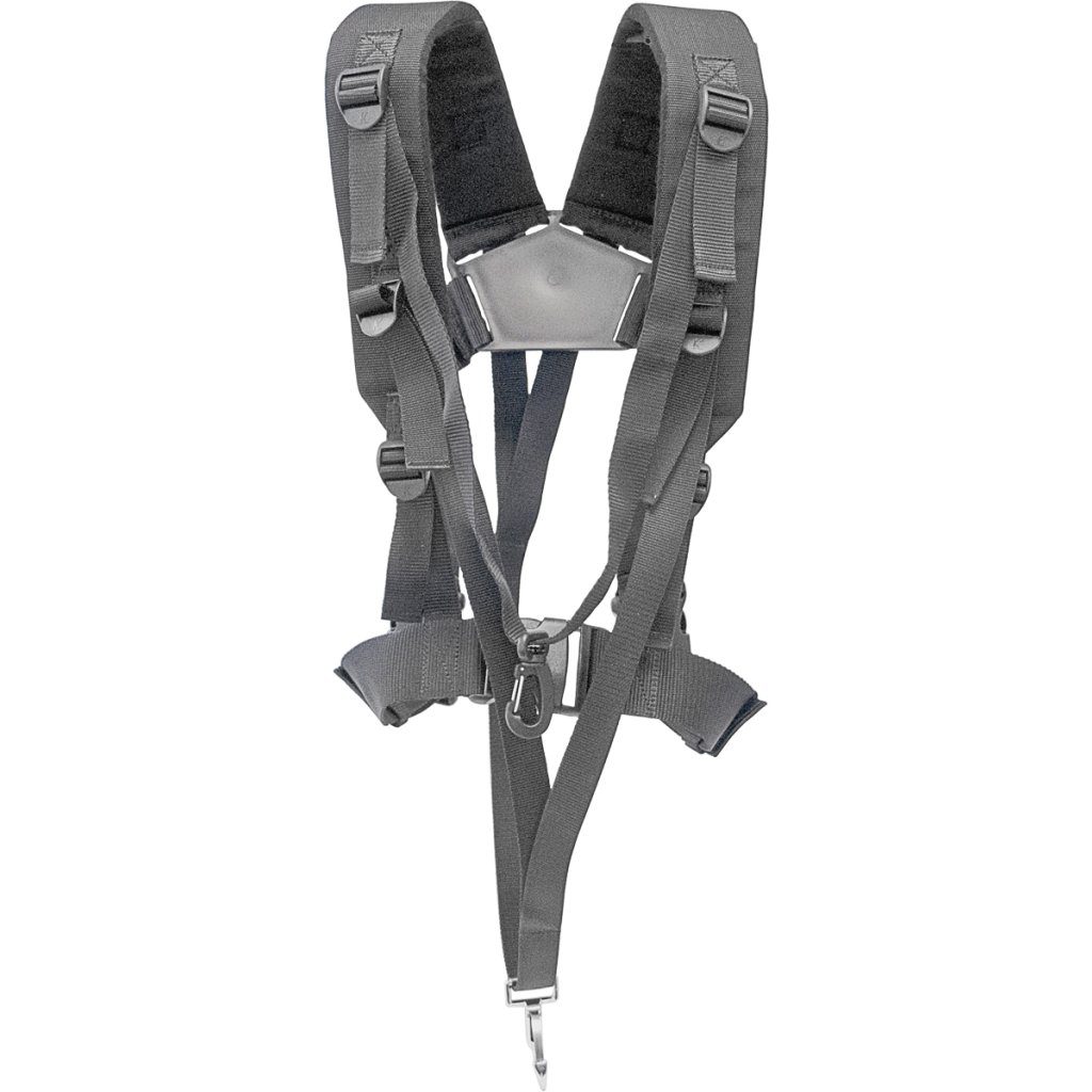 Tento polstrovaný popruh rovnomerne prenáša hmotnosť na obe ramená, čím uľavuje namáhanej chrbtici a krku. O pripevnenie k nástroju sa starajú dve karabíny; jedna je vyrobená z odolného plastu, druhá je kovová.