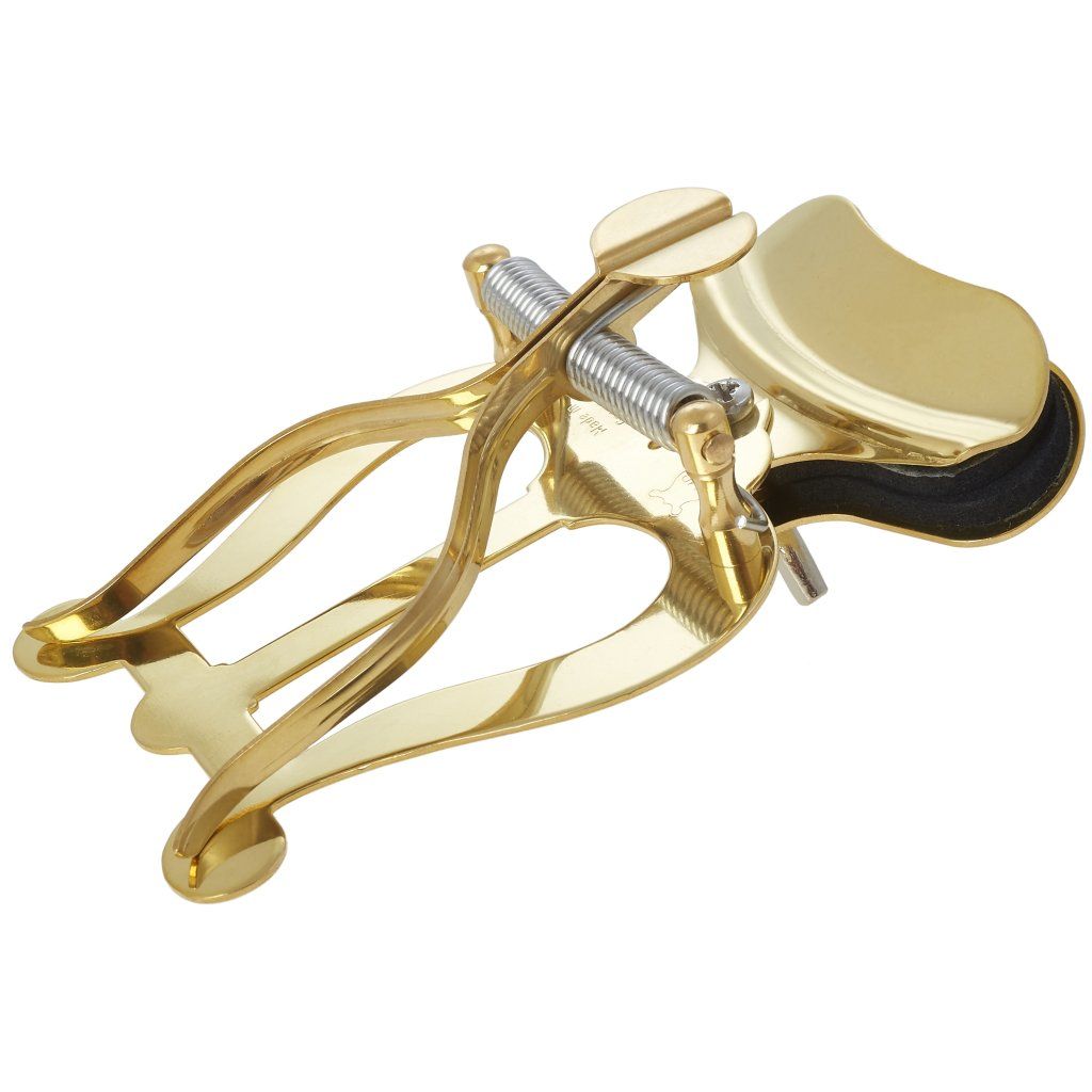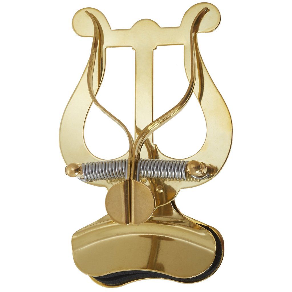 Mosadzná lyra (držák not) pre stredne veľké trúbky s dvoma tlakovými podložkami a upevnením na zvonec nástroja.