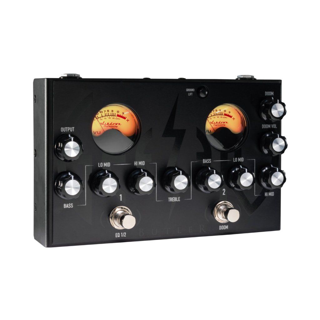 Signature efekt Geezera Butlera Pedal of Doom s duálními VU metry, přepínatelným duálním EQ a přepínatelným overdrivem