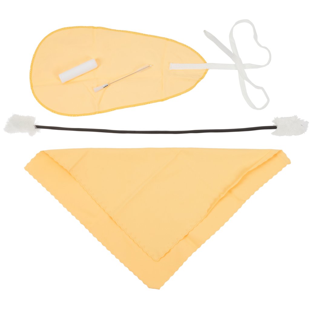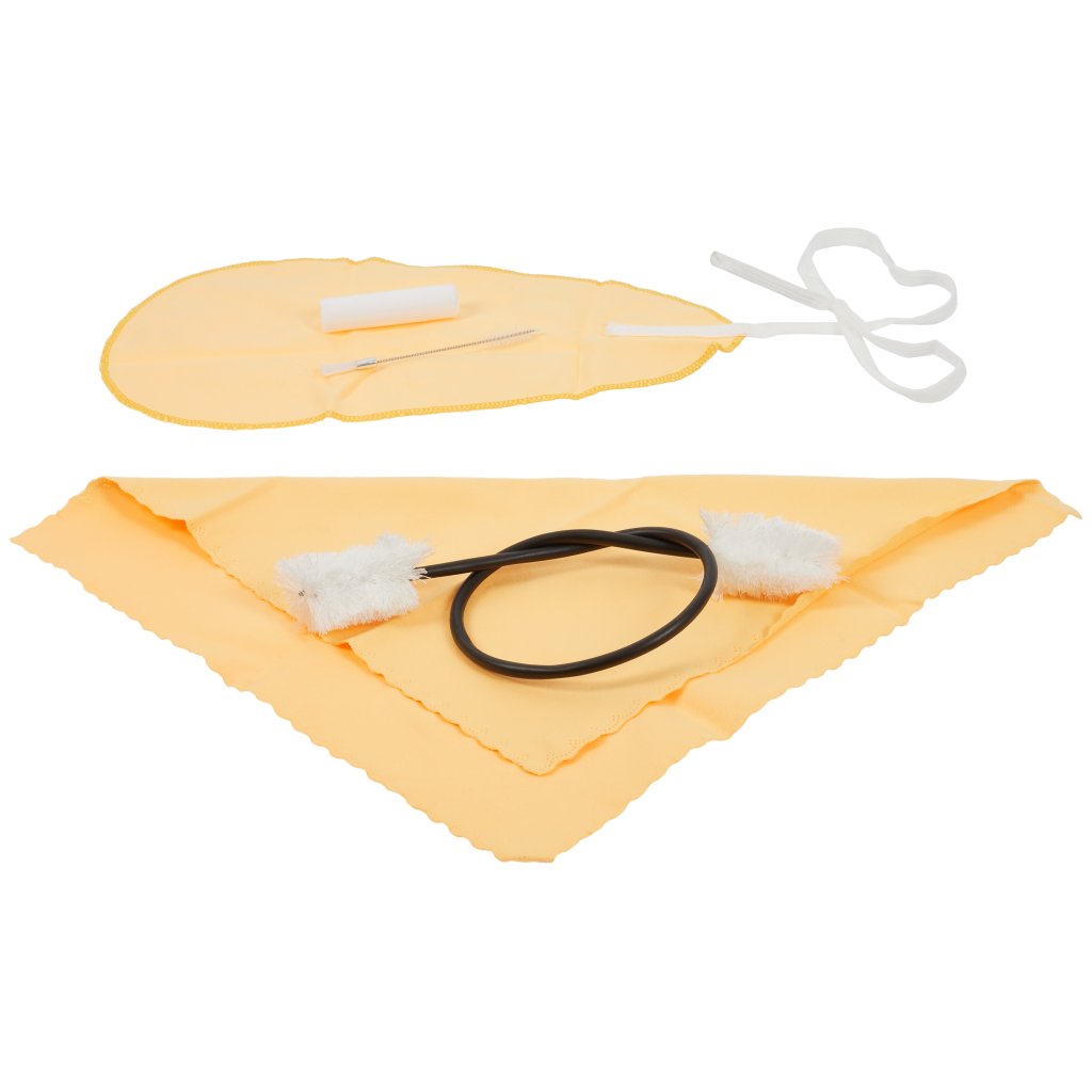 Súprava Bacio Flute/Piccolo Care Kit obsahuje dve utierky na čistenie tela, nôh a hlavice (tampón na ruky, tampón na cievky), korkové mazivo, handričku a kefku na čistenie mechaniky (ventily, pružiny).