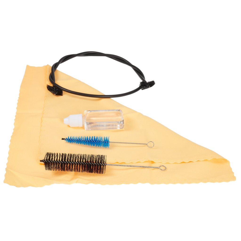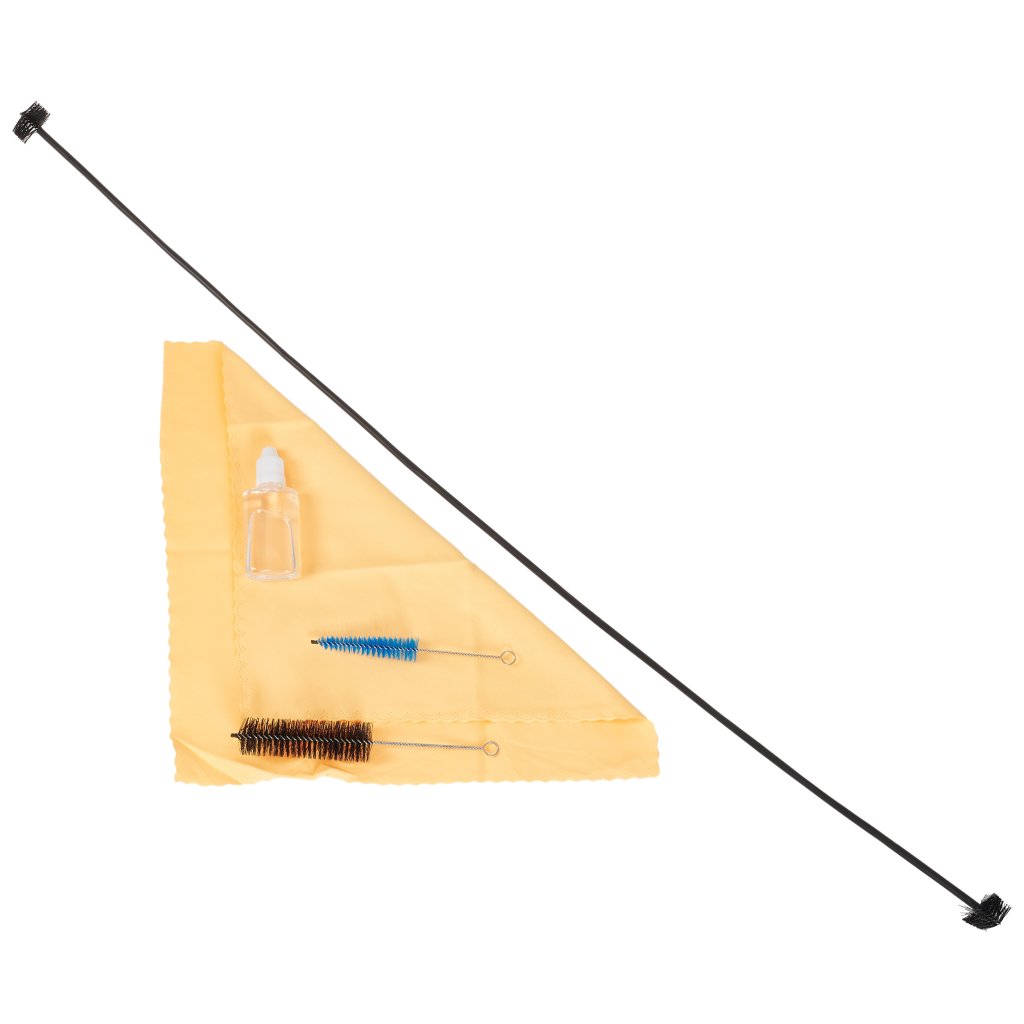 Súprava na starostlivosť o trúbky Bacio obsahuje kefku na čistenie píšťal, had na čistenie otvorov, kefku na čistenie ventilov a puzdier ventilov, olej na čistenie ventilov a čistiacu handričku.