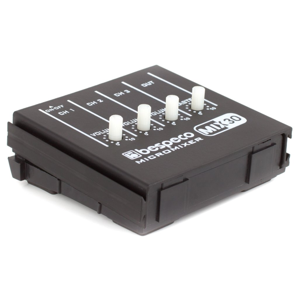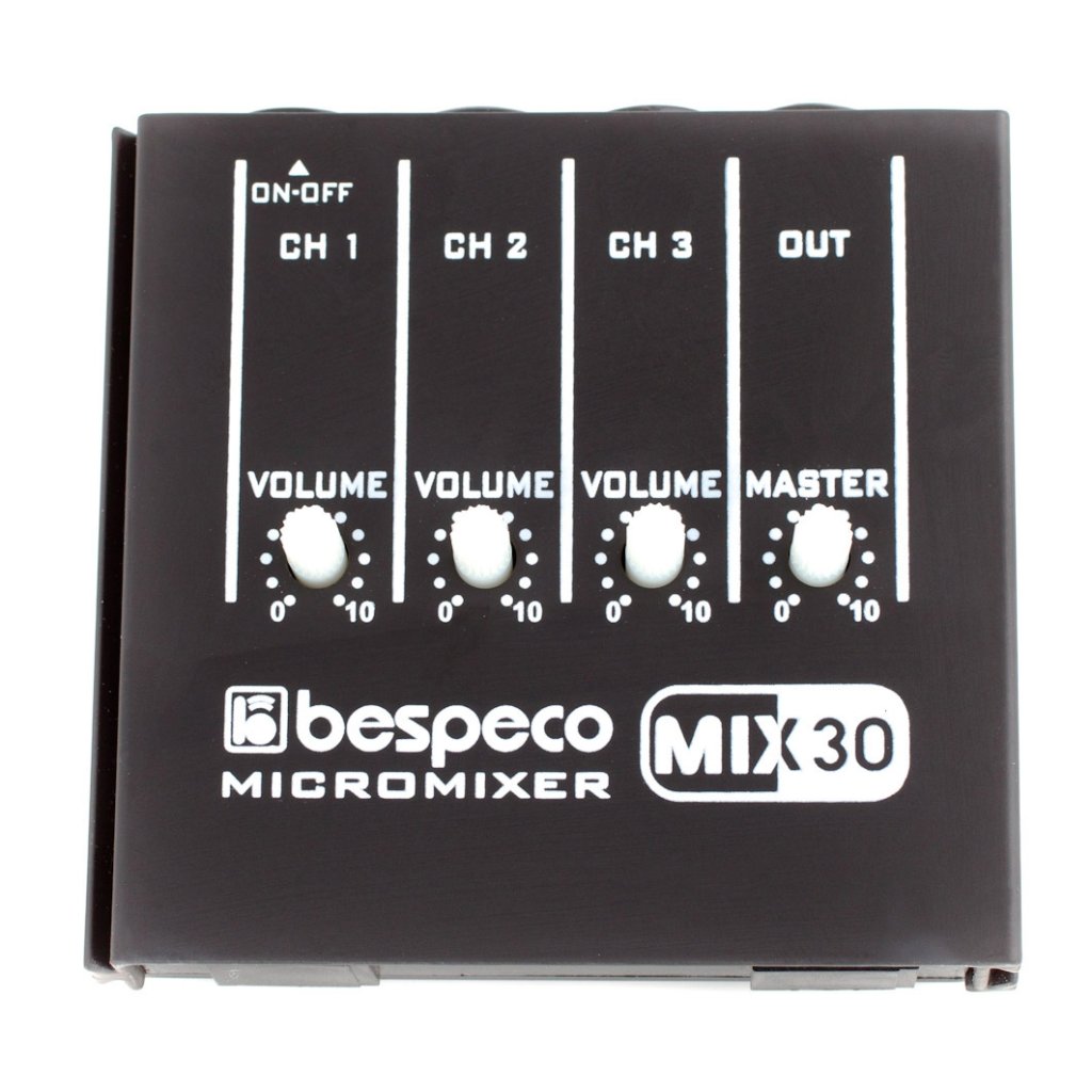 Bespeco MIX30 je jednoduchý malý trojkanálový mixážny pult, ktorý umožňuje pripojiť 3 mono signály, zmiešať ich pomocou potenciometrov hlasitosti a poslať ich na mono výstup. Napájanie zabezpečuje 9 V batéria (nie je súčasťou balenia).