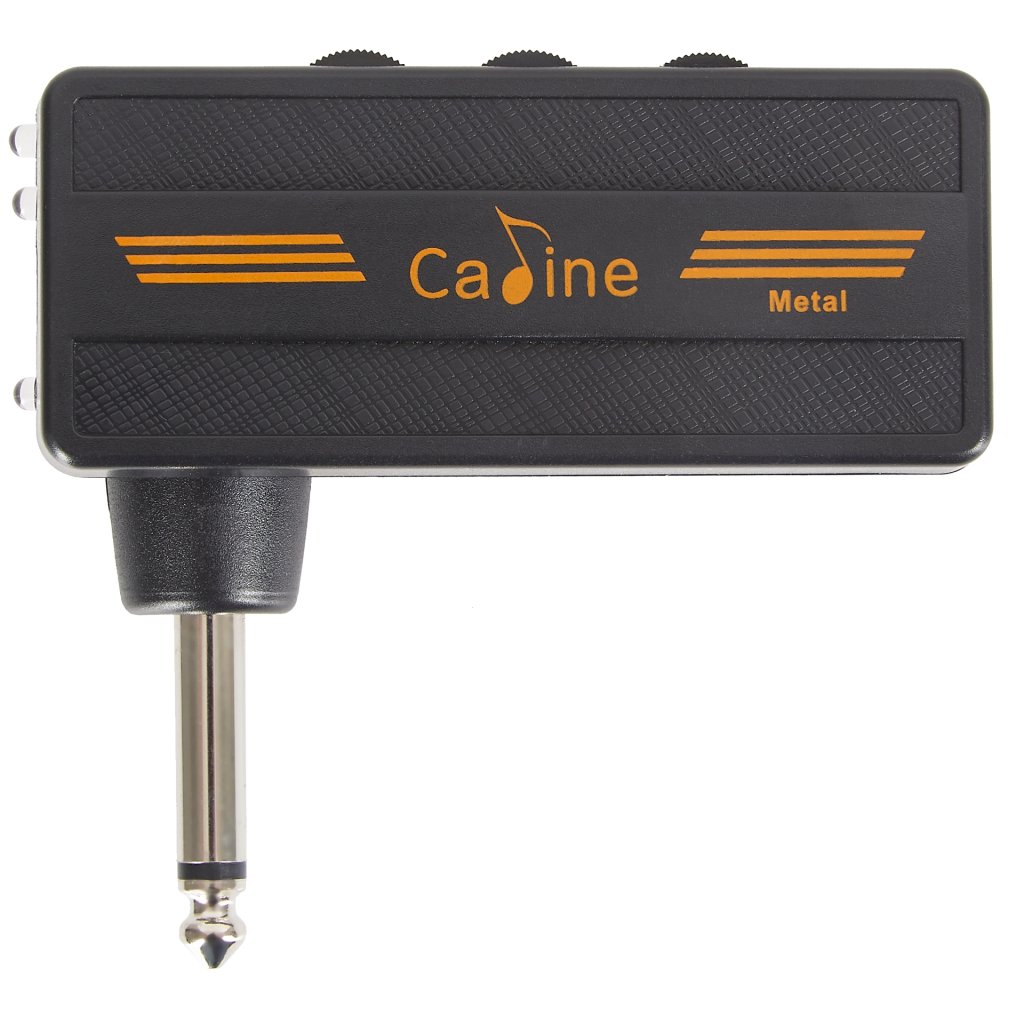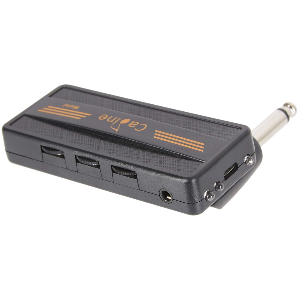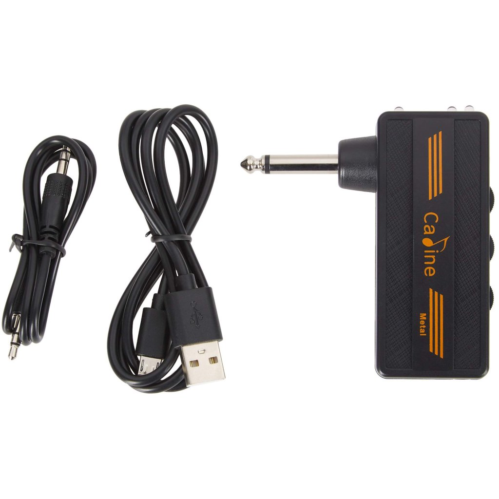 Gitarový slúchadlový zosilňovač Caline so zabudovaným efektom skreslenia, otočným ovládaním hlasitosti, ekvalizérom a skreslením, vstupom Aux In pre externý zvuk, vstupom pre slúchadlá a dobíjacou batériou s výdržou až osem hodín (dobíjanie pomocou priloženého USB kábla).