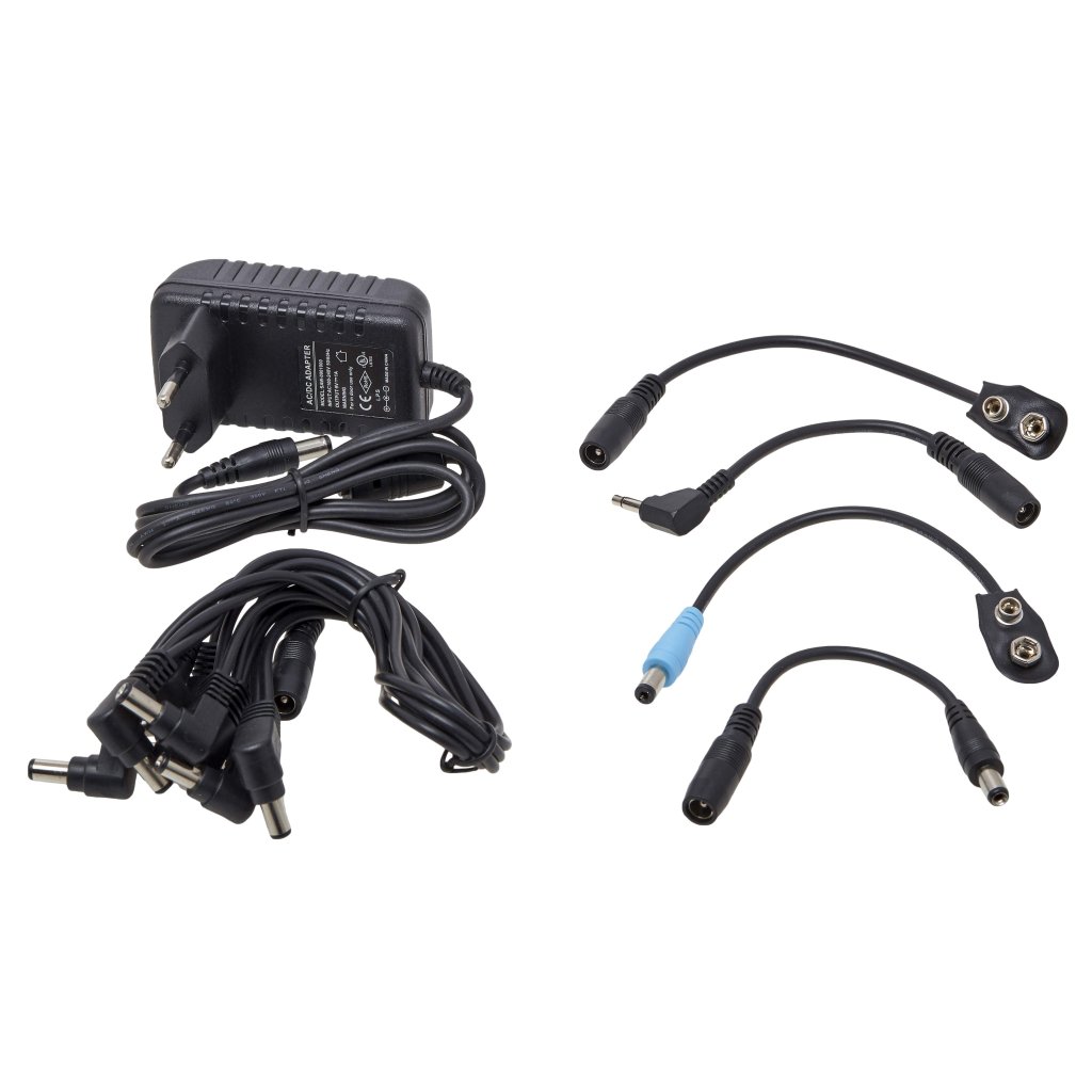 Napájací adaptér 9V (centier negative) čínske značky Caline. Súčasťou balenia je napájací adaptér, daisy chain kábel (Multi-Plug) pre napájanie vašich pedálových efektov, dva redukčné káble a dva napájacie káble pre 9V batériu.