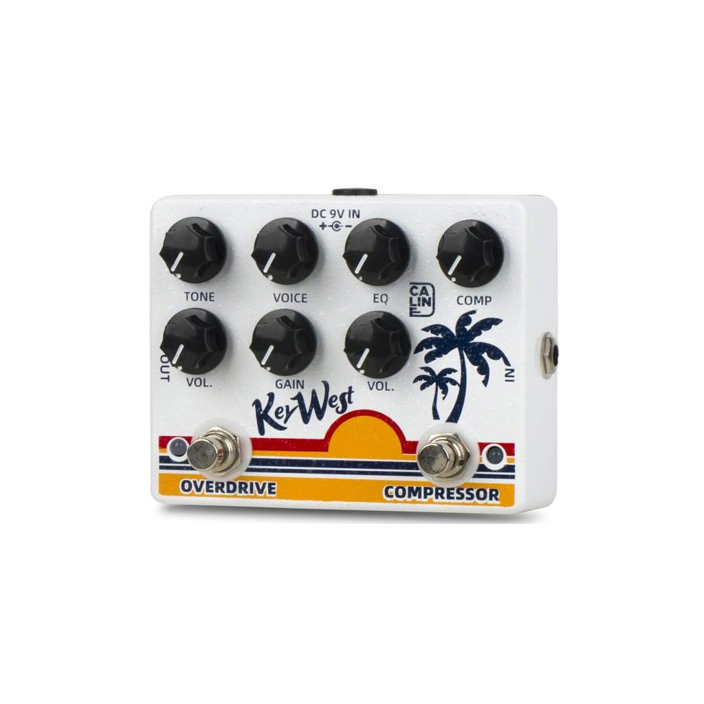 Pedálový efekt Caline Key West spojuje v jednom šasi kompresor s transparentním lo-gain overdrive pedálem. Kompresor vám pomůže vytvarovat váš kytarový tón přesně podle vašich představ. K tomu účelu slouží ovladače krabičky určující sílu výstupního signálu, charakter/barvu tónu a míru komprese/dynamiky. Samostatně aktivovatelný transparentní overdrive s dvoupásmovým ekvalizérem dodá vašemu kytarovému zvuku větší lesk.