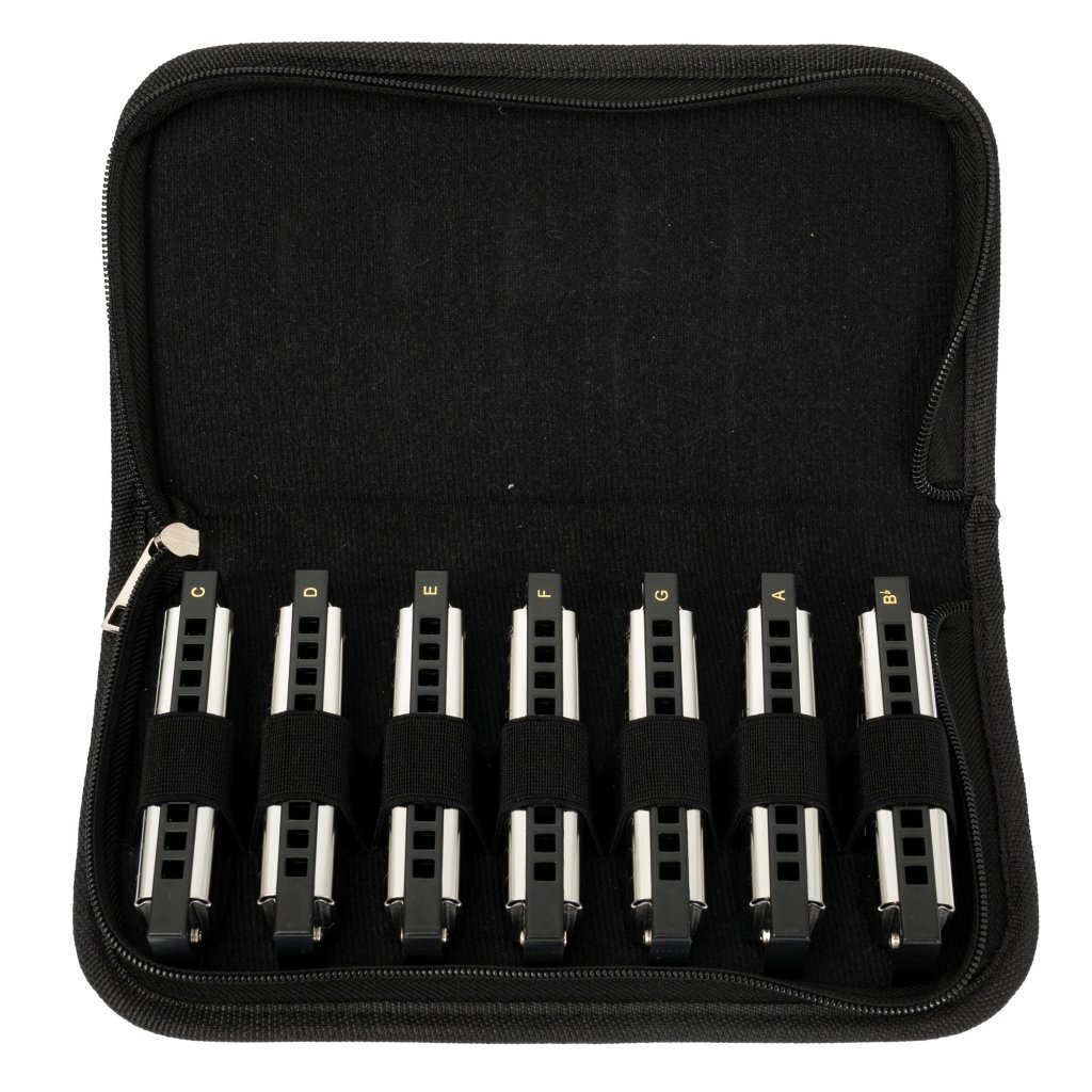 Sada siedmich diatonických harmoník Cascha v ladeniach C, D, E, F, G, A a H/Bb v praktickom mäkkom puzdre. Harmoniky Casha zo série Blues sú určené najmä pre začínajúcich hudobníkov a všetkých, ktorým sa hodí lacná bluesová harmonika do vrecka. Harmoniky majú plastové telo a mosadzné hlavice.