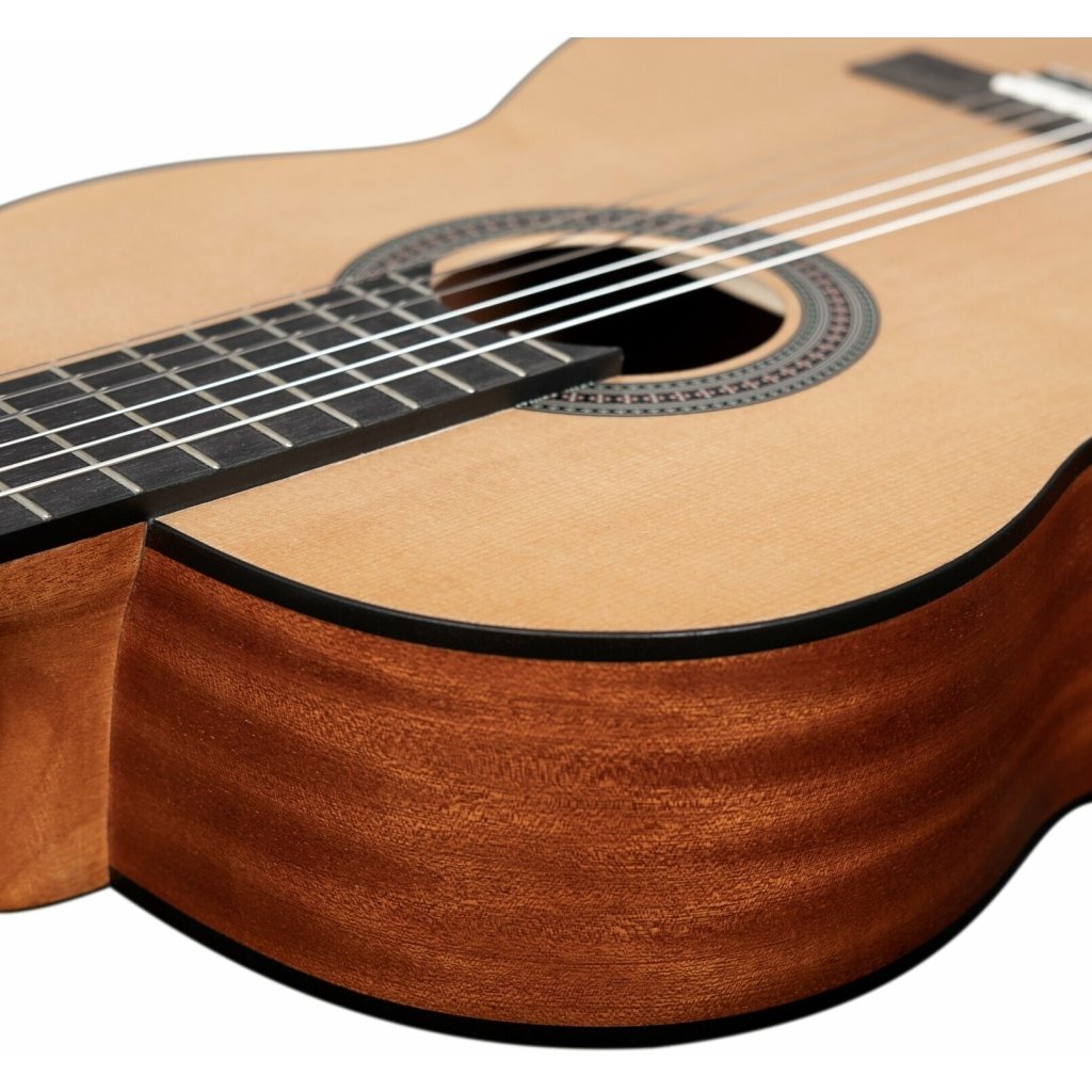 CASCHA Stage Series CGC 200 3/4 je klasicky tvarovaná klasická so skrátenou menzúrou na 58 centimetrov. Vybrané tónové drevá poskytujú tomuto modelu plný, teplý zvuk s dlhou výdržou. Vrch gitary je vyrobený z laminovaného smreku, zadná časť a boky sú vyrobené z kvalitného mahagónu, rovnako ako krk. Hmatník a mostík sú vyrobené z odolného amarantu (Purple Heart).
