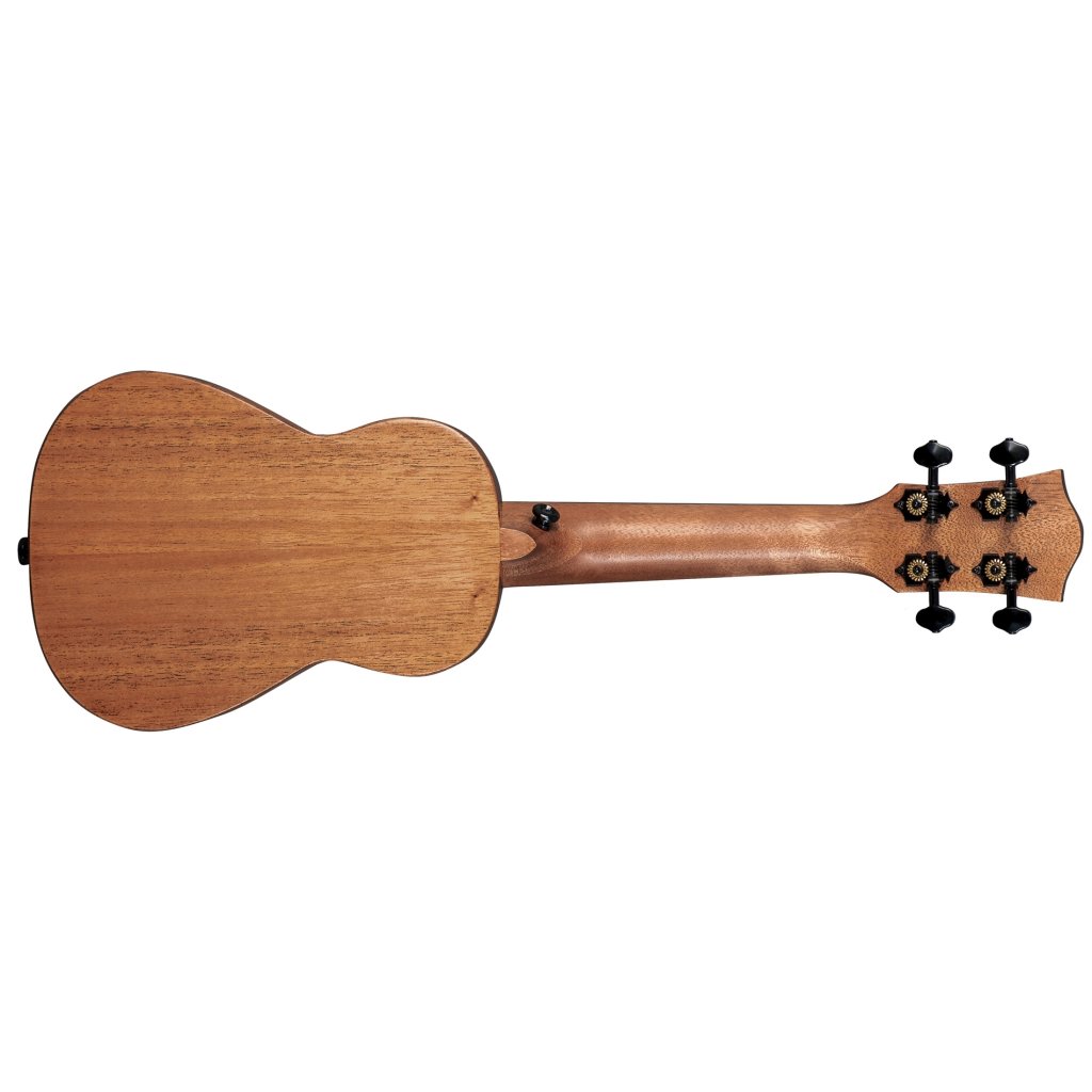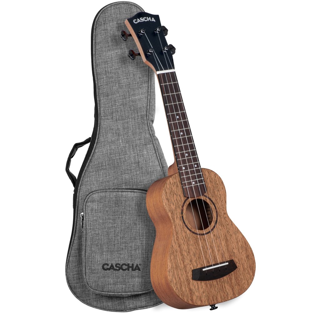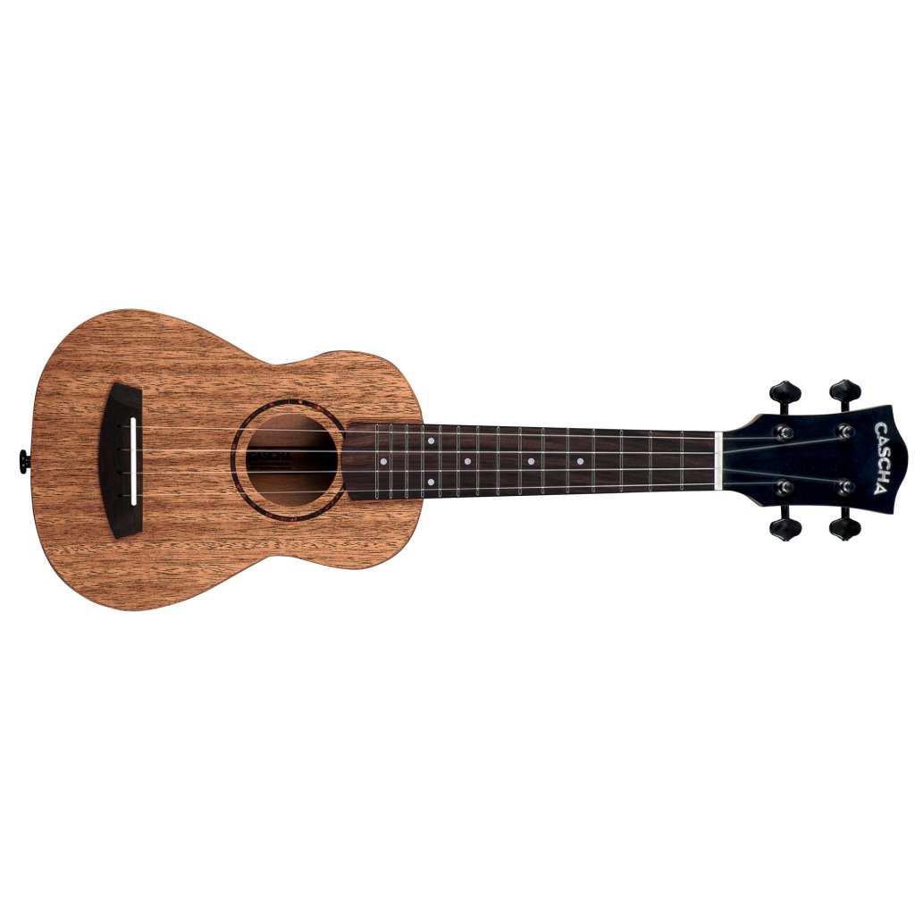 Cascha CUSMS1 Soprano Ukulele Mahogany Solid je sopránové ukulele s vřelým plným zvukem celomasivního mahagonového těla, který jistě potěší i náročnější hráče na ukulele. Ke krku ze dřeva okoumé je přilepen palisandrový hmatník osazený patnácti pražci. Struny jsou přes nultý a sedlový pražec z kosti uchyceny v černých otevřených ladících mechanikách kytarového typu a palisandrové kobylce. Pěkné zpracování podtrhuje rozeta z imitace želvoviny.