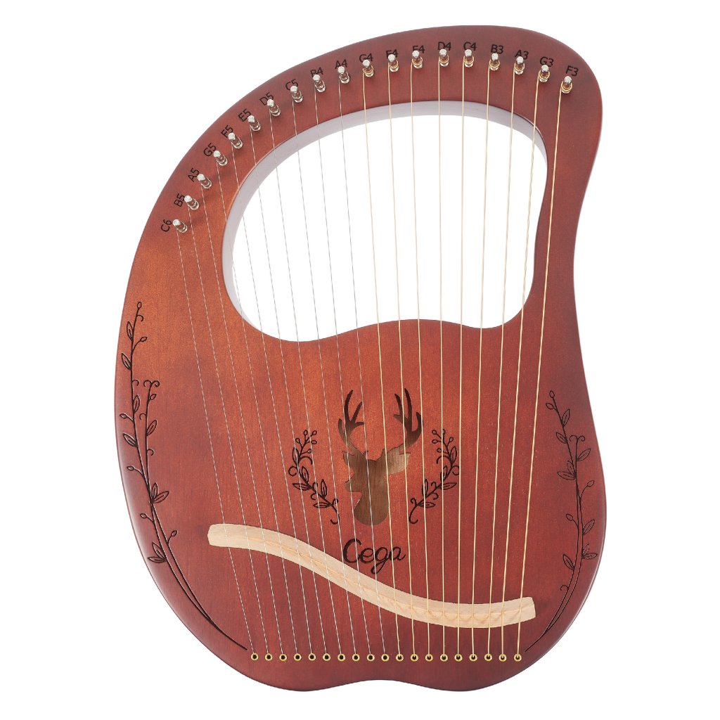 Lyra LH19C je v kávové barvě, má devatenáct strun a je zdobena řezbou okolo ozvučného otvoru ve tvaru jelena.