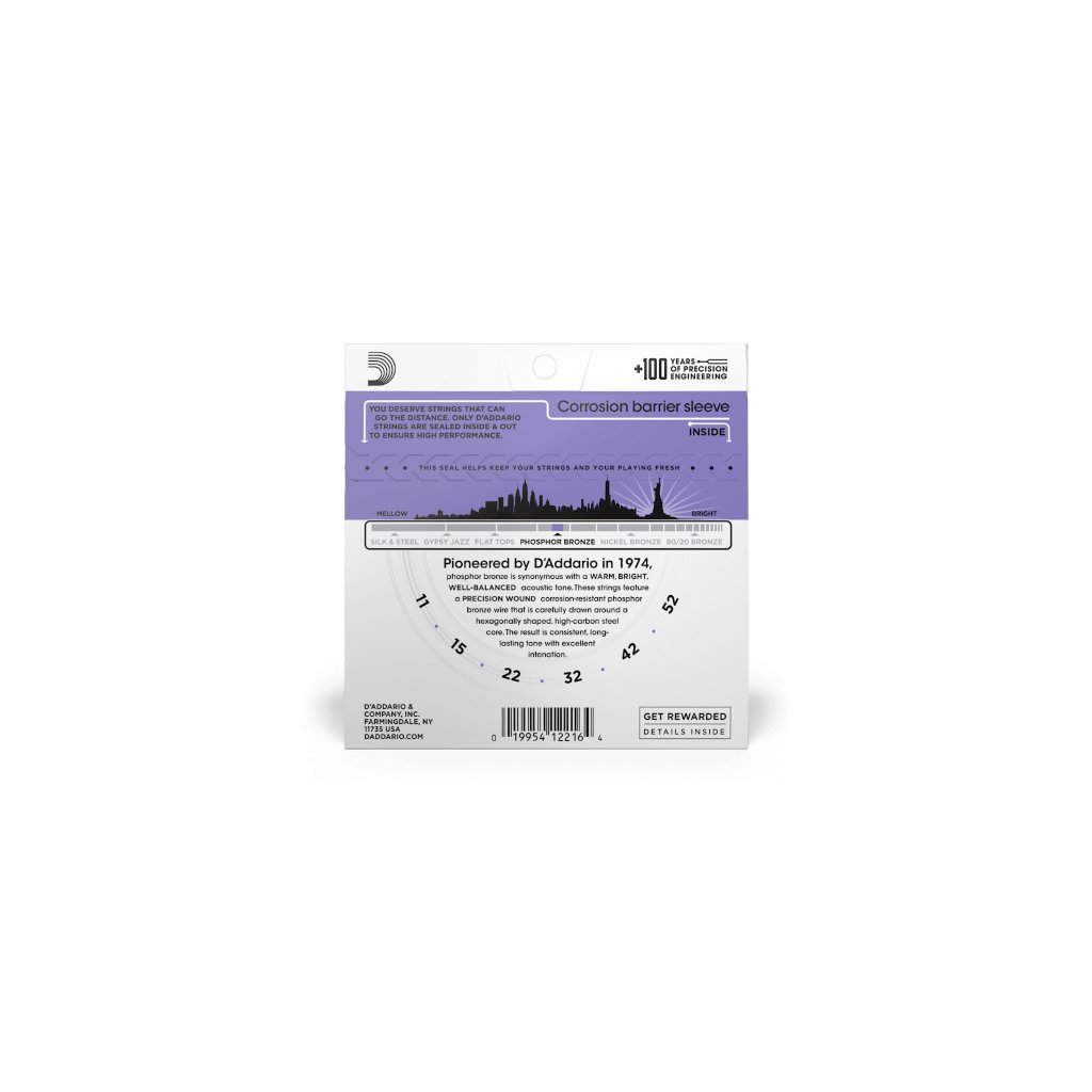 Spoločnosť D':Addario ako prvá použila fosforový bronz v strunách pre akustickú gitaru už v roku 1974. Dnes sa na struny Phosphor Bronze hrá po celom svete a vďaka ich nádhernej zvukovej vyváženosti a tonálnej hrejivosti sa považujú za štandard v oblasti akustických strún. Naše priekopnícke struny pre akustickú gitaru Phosphor Bronze sú precízne vinuté fosforobronzovým ovinutým drôtom na jadre z vysoko uhlíkovej ocele, čo poskytuje tonálnu univerzálnosť vhodnú pre všetky akustické štýly a hudobné žánre. Tieto struny s meničom 11-52 Custom Light majú o niečo väčšiu hlasitosť a projekciu ako struny Extra Light, pričom sa na ne stále ľahko hrá.