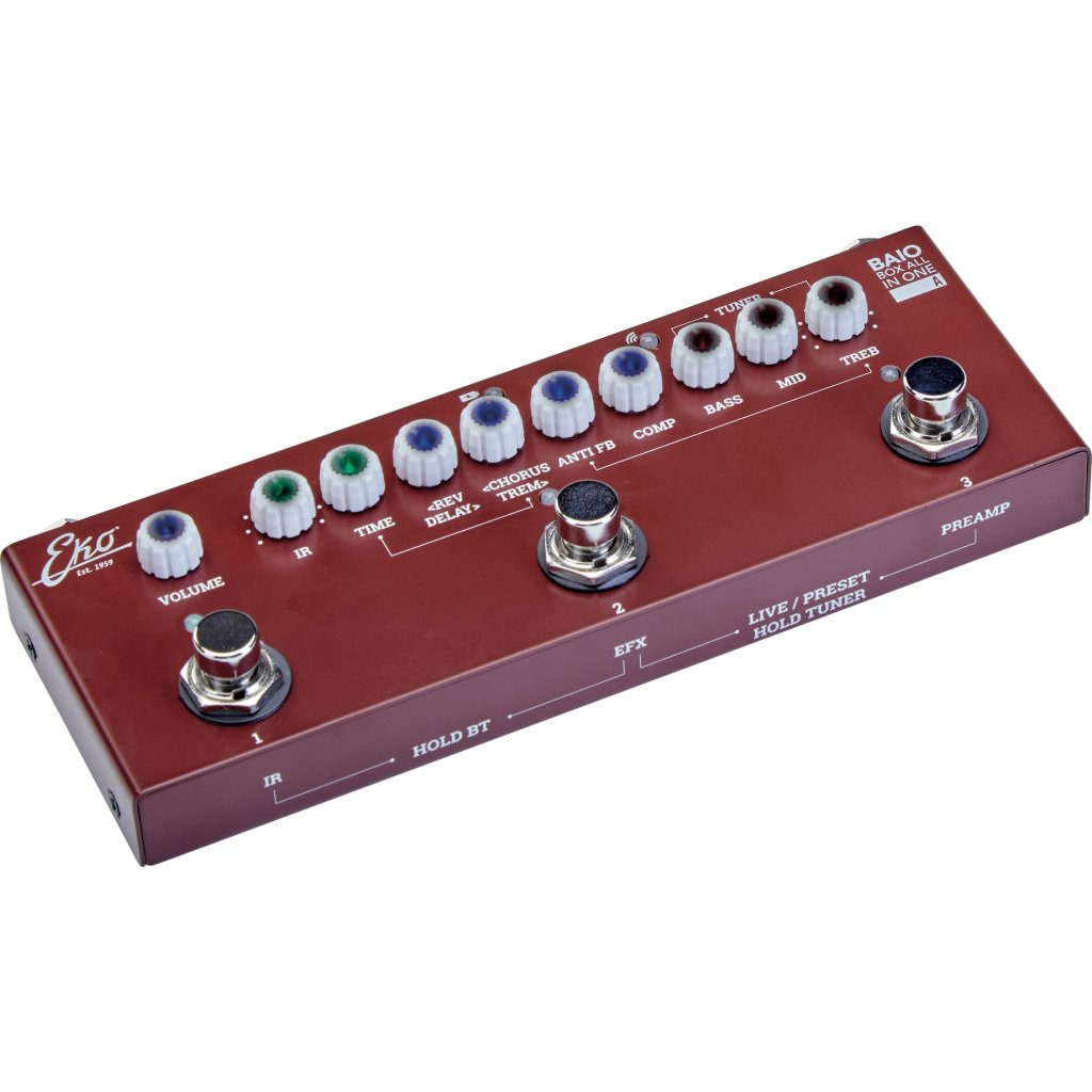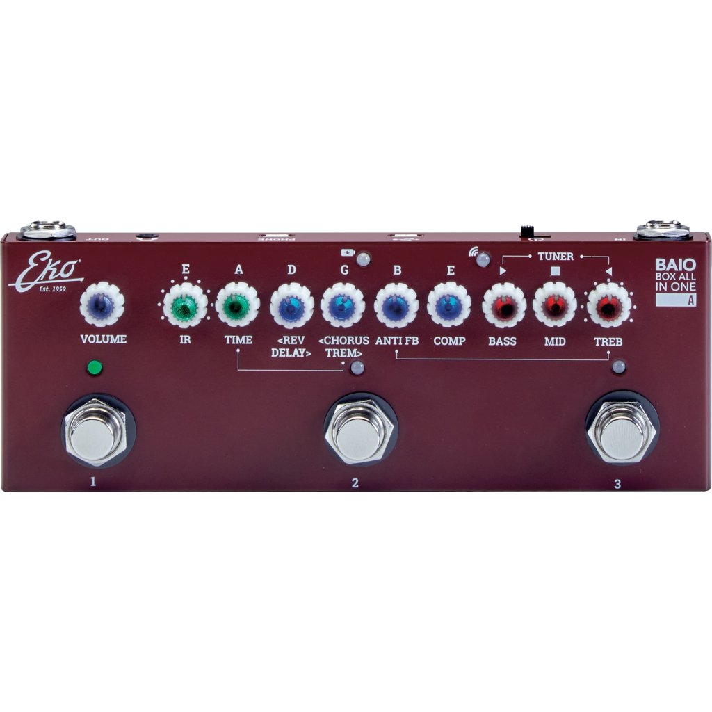 Eko Guitars BAIO A (Box All In One) je multiefektový pedál so zabudovaným IR pre akustickú gitaru, klasickú gitaru a akustickú basgitaru. Je vybavený 8 IR mikrofónom snímaných akustických nástrojov, plným ovládaním tónu, kompresorom, potlačením spätnej väzby, chorusom, tremolom, reverbom, delayom, zabudovanou ladičkou s funkciou Mute, nástrojovým vstupom a výstupom, stereo výstupom pre slúchadlá, blutooth pripojením ako audio rozhranie s PC/Mac a smartfónom. Ideálny pedál, s ktorým budete mať svoje zvuky vždy pri sebe.