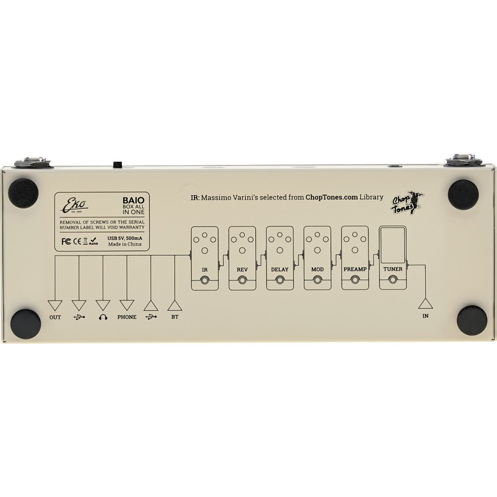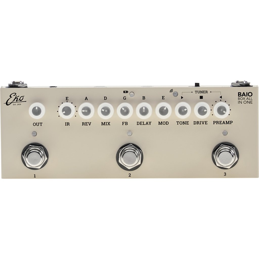 Eko Guitars BAIO E (Box All In One) je kompletný prenosný multi-efektový pedál, ideálny pre vašu gitaru. Vďaka 9 zabudovaným typom predzosilňovačov, 8 IR (Impulse Response) a integrovaným efektom budete môcť plne ovládať svoj zvuk. Vyskúšajte ho ako zvukové rozhranie s vaším počítačom alebo smartfónom a použite BT na hranie spolu s vašimi doprovodnými skladbami.