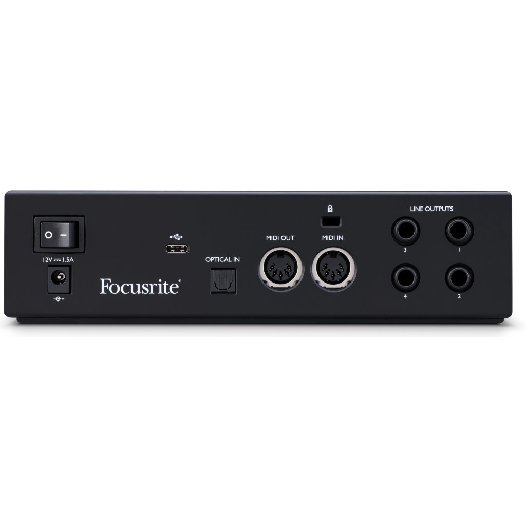 Clarett+ 2 Pre má 2 kombinované mikrofónové a nástrojové HiZ vstupy. Rozhranie ADAT pojme ďalších 8 vstupov a zadný panel ponúka 4 linkové TRS výstupy. Konektivita je rozšírená o slúchadlový výstup a MIDI In/Out. Nové USB-C umožňuje priame napájanie bez potreby DC adaptéra, avšak adaptér je súčasťou balenia pre prípad pripojenia cez USB 2.0 a vyššie. Výbavu dopĺňa dvojica USB káblov a softvérový balík hudobných aplikácií vrátane bohatej knižnice zvukov a samplov.