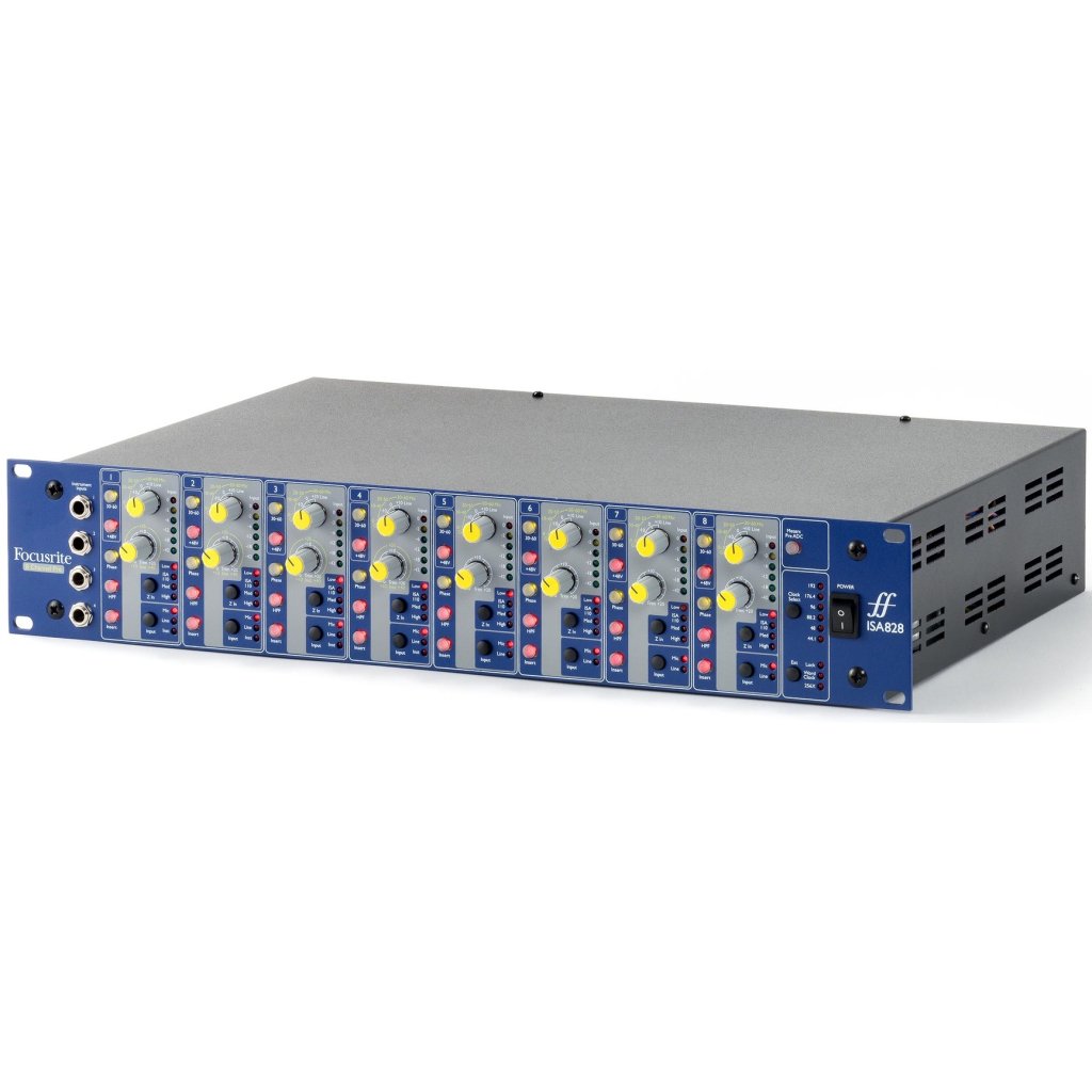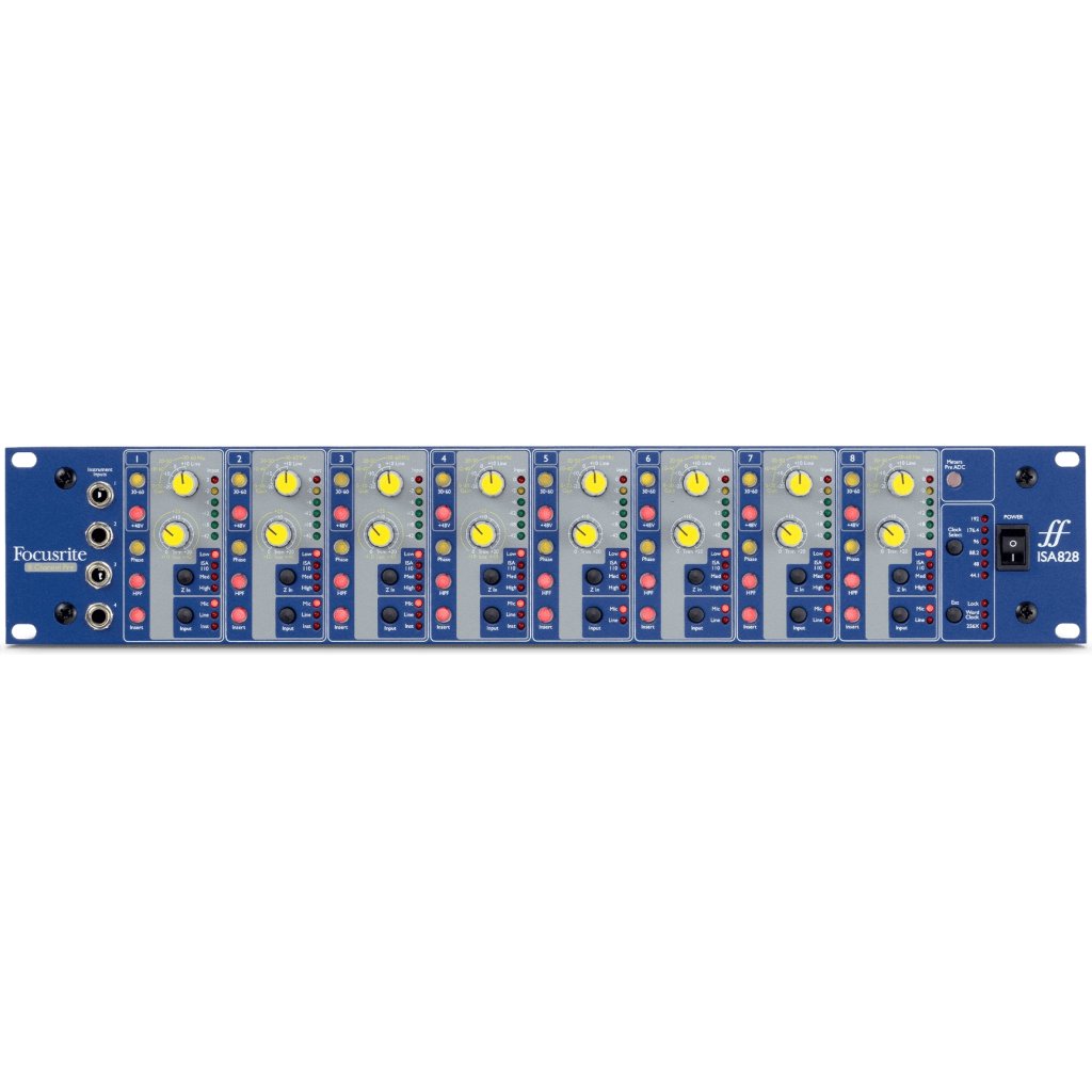 Focusrite ISA 828 MKII je univerzálny a flexibilný osemkanálový mikrofónový predzosilňovač v prevedení 2U rackovej jednotky osadený vstupnými transformátormi Lundahl a nezávislými linkovými a nástrojovými vstupmi. Topológia preampu vychádza z obvodu pôvodnej verzie ISA110 navrhnutej Rupertom Nevem, teda zo zapojenia, ktoré sa používa už niekoľko dekád v najúspešnejších výrobkoch značky Focusrite. Vstupný transformátor Lundahl LL1538 používaný v pôvodných moduloch RED prepožičiava zvuku zvláštny charakter, ktorý nemožno napodobniť žiadnym iným spôsobom. Ďalším výrazným prvkom, ktorý ovplyvní zvuk pripojeného mikrofónu je možnosť zvoliť jednu zo štyroch starostlivo prednastavených impedancií (Low/ISA 110/Med/High). Táto voľba skutočne významne ovplyvňuje vstupný zvuk, a vy tak môžete experimentovať a vyzdvihnúť charakter mikrofónu alebo sa naopak rozhodnite pre úplne transparentný prejav, záleží len na vás. Predzosilňovač ponúka v rámci každého kanála nezávislé nastavenie všetkých dôležitých funkcií, ktoré začínajú možnosťou voľby impedancie a precízneho nastavenia zisku pomocou dvoch potenciometrov a tlačidla rozsahu, vďaka tejto kombinácii je hodnota vstupného zisku až 80 dB. Ďalej tu nájdete spínače pre fantómové napájanie, otočenie fázy, zaradenie insertných kanálov do signálovej cesty a fixné HP filtre. Okrem hlavných mikrofónnych (8 x XLR) a linkových (8 x Jack 6,3 mm TRS) vstupov na zadnom paneli sú na prednom paneli k dispozícii nástrojové vstupy (4 x Jack 6,3 mm) a môžete teda využiť potenciál predzosilňovača aj na obohatenie zvuku vašich nástrojov. Dvojica terminálov DB25 (A-D external inputs a Analogue outputs) slúžia na pripojenie externých zariadení (insert SEND/RETURN) a tieto vstupy a výstupy aktivujú tlačidlá Insert na čelnom paneli. Ak potrebujete iba analógový výstup, použijete príslušný terminál DB25 na pripojenie multipárového výstupného kábla. Predzosilňovač je možné rozšíriť o voliteľnú kartu ISA ADN8, ktorá pokytuje špičkovú A/D konverziu signálu.