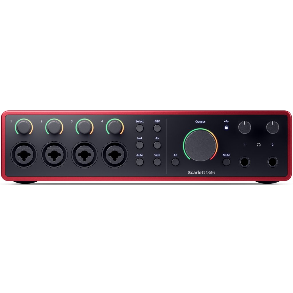 Focusrite Scarlett 18i16 4th Generation je USB-C audio rozhraní s 18 vstupními a 16 výstupními kanály. Analogovou část tvoří 4 hlavní kombinované vstupy pro mikrofon, linkové nebo nástrojové signály a další 4 linkové vstupy jsou k dispozici na zadním panelu. Analogový výstup zahrnuje 4 kanály a umožňuje připojení dvou párů studiových monitorů s možností jejich přepínání tlačítkem Alt. K dispozici je rovněž dvojice sluchátkových výstupů s individuální možností nastavení hlasitosti a dále plnohodnotné rozhraní MIDI. Digitální periferie disponuje optickým rozhraním ADAT pro připojení dalších 8 kanálů na vstupu i výstupu, případně stereo SPDIF.