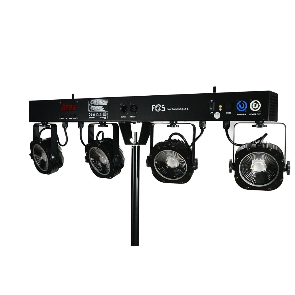Led Par System, 4 LED 30 watt COB RGBW, Pixel Control, 25° uhol vyžarovania, DMX režim, IR diaľkové ovládanie, powercon in/out, vstavané programy, čierny stojan v cene.