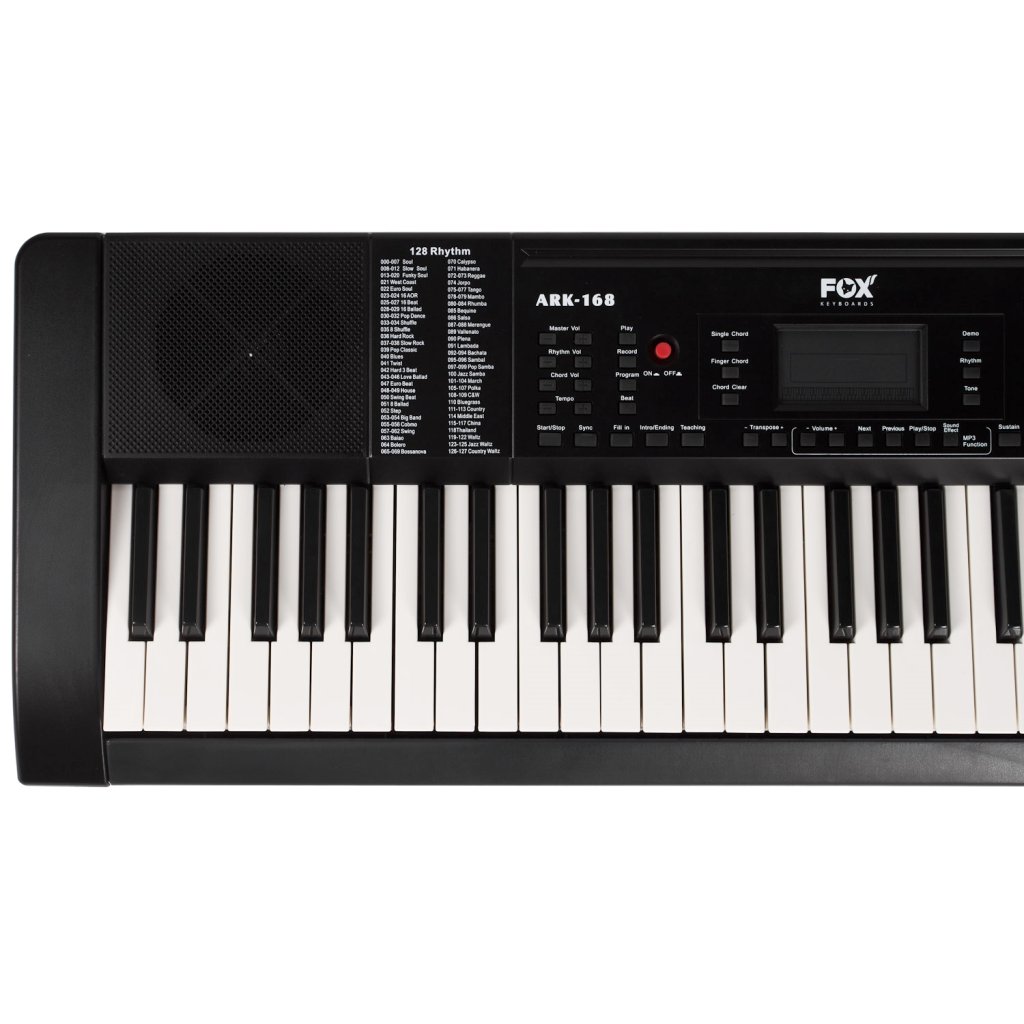FOX 168 ponúka 61 klávesov štandardnej veľkosti s dynamikou, 128 zvukov a 128 automatických sprievodov. K dispozícii sú aj pokročilé funkcie ako Split (rozdelenie klaviatúry na hranie dvoch nástrojov súčasne), Dual Voice (vrstvenie zvukov) a nastavenia Sustaine (reverb) a Vibrato. Klaviatúru možno tiež transponovať, čo ocenia začiatočníci aj pokročilí hráči. Samozrejmosťou je možnosť hrať akordy jedným prstom, funkcia nahrávania na nahrávanie vašich pokusov alebo metronóm a výukový systém. Ku klávesom môžete pripojiť mikrofón alebo externé zariadenie s obľúbenými nahrávkami a jamovať s nimi. Vďaka výstupu MIDI Out možno klávesy používať aj ako ovládač pre hudobný softvér.