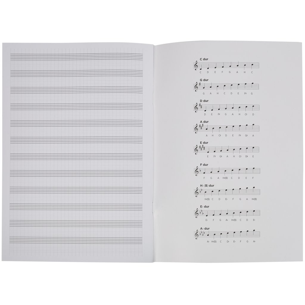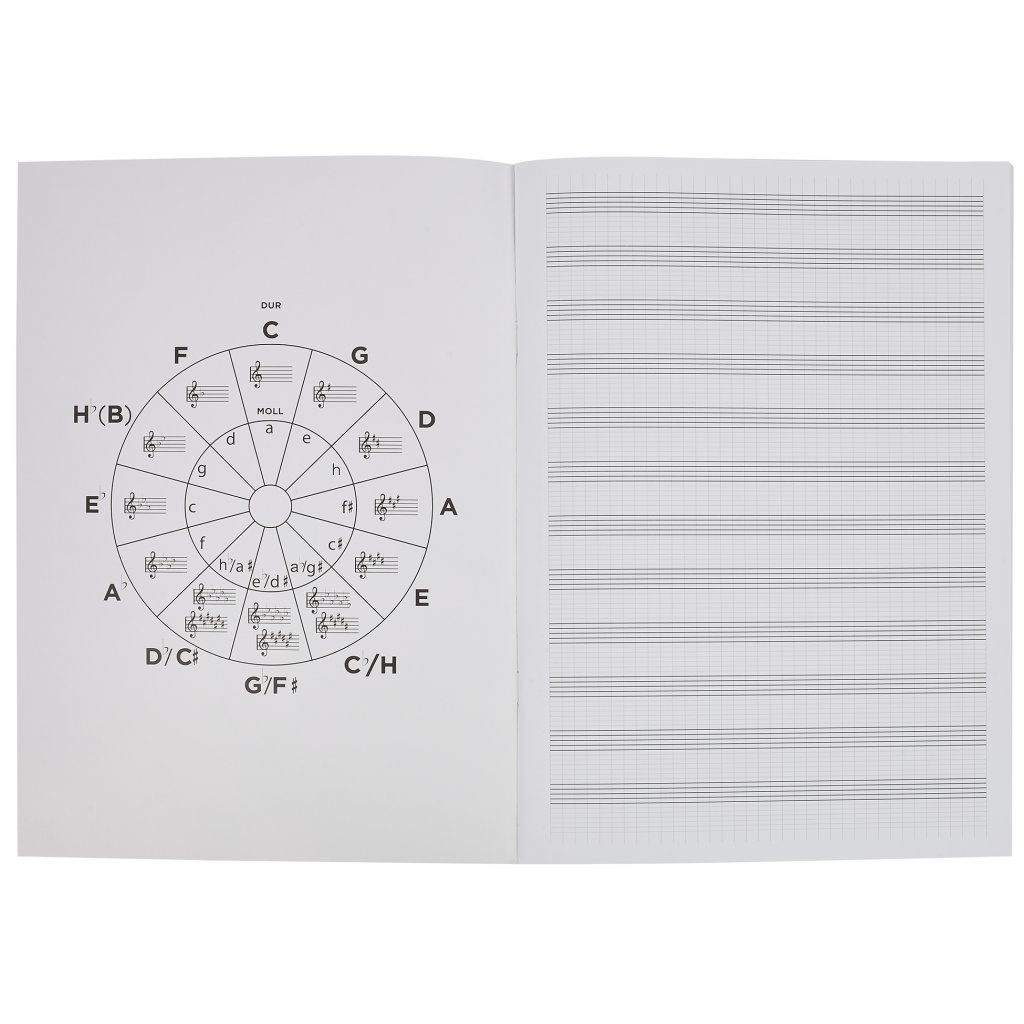 Notová kniha formátu A4 s dvadsiatimi šiestimi listami a mnemotechnickými pomôckami v podobe stupníc alebo kvintového kruhu.