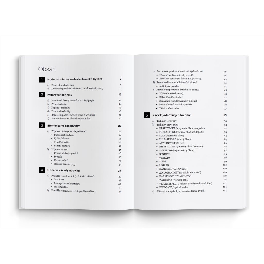 Skladateľ, textár, hudobný pedagóg a predovšetkým gitarista Marek Šimůnek sa vo svojej knihe venuje všetkým známym gitarovým technikám z praktického hľadiska. Podrobne opisuje históriu a použitie každej techniky a potom vysvetľuje, ako ich dosiahnuť a praktizovať. Okrem toho je každá kapitola doplnená rozsiahlou fotografickou dokumentáciou.
