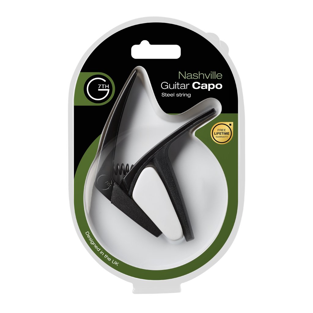 Nashville od G7th je praktický ľahký pickguard vybavený pružinovým mechanizmom pre jednoduché upnutie/odopnutie na krk gitary. Prenáša napätie rovnomerne na všetky struny, vďaka čomu ich udržiava naladené. Časti prichádzajúce do kontaktu s krkom gitary sú vybavené silikónovou pogumovanou vložkou, ktorá zabraňuje poškodeniu.