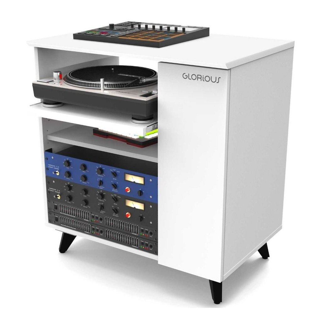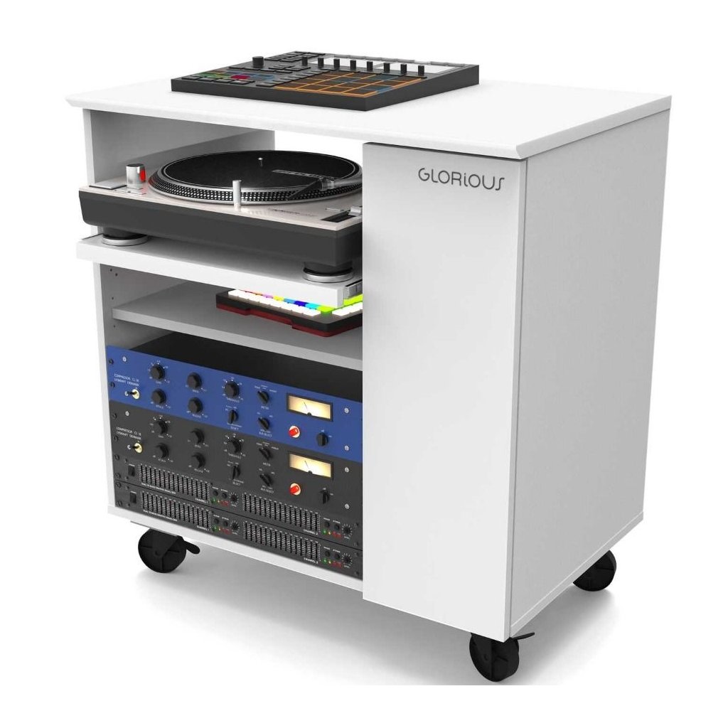 Žiadne dve nahrávacie štúdiá nie sú rovnaké, preto bol Glorious Modular Side Rack navrhnutý s ohľadom na maximálnu flexibilitu. Tento štýlový kus štúdiového nábytku je variabilný rack rozdelený na dve hlavné časti, ktoré dokonale doplnia rady Soud Desk a Wokbench. Väčšia (ľavá) časť sa skladá z priestoru pre rack (až 12U), ktorý možno čiastočne využiť na inštaláciu dvoch políc, z ktorých jedna je vybavená praktickým výsuvným mechanizmom. Obidve časti možno výškovo nastaviť alebo vybrať len jednu (alebo žiadnu), aby sa uprednostnil priestor najmä pre regálové jednotky. Spôsob, akým navrhnete rozloženie, potom priamo určuje možnosti usporiadania zariadenia, pričom pevný policový diel sa používa na zariadenia, ku ktorým nepotrebujete stály prístup, zatiaľ čo výsuvnú podložku možno použiť na kontroléry, bicie automaty, klávesy alebo dokonca gramofón. Na pravej strane komody sa nachádza užšia priehradka s dvierkami, ktorá je určená buď na uloženie LP platní, alebo na umiestnenie počítača. Menšia polička slúži na uloženie príslušenstva (napr. slúchadiel). Horná doska je potom k dispozícii pre iné potreby.