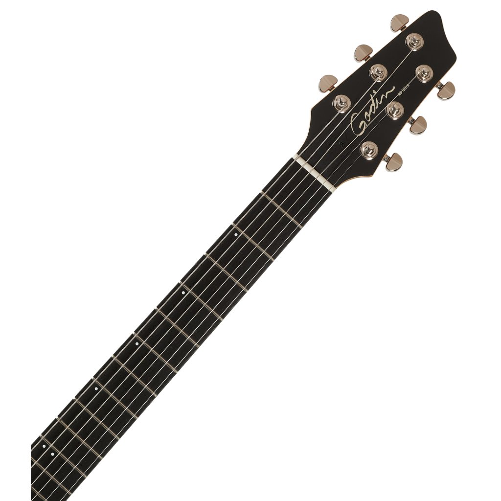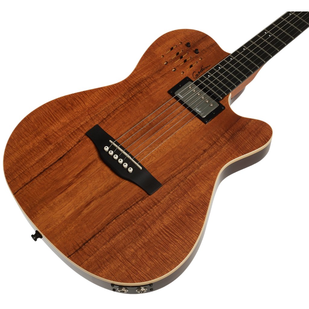 Telo Godin A 6 ULTRA Extreme Koa HG je vyrobené z komorovaného striebornolistého javora. Vrchnú dosku z exotického dreva koa zdobí lesklý lak. Mahagónový krk je prilepený k modernému hmatníku Richlite osadenému dvadsiatimi dvoma pražcami.