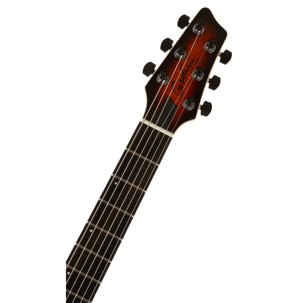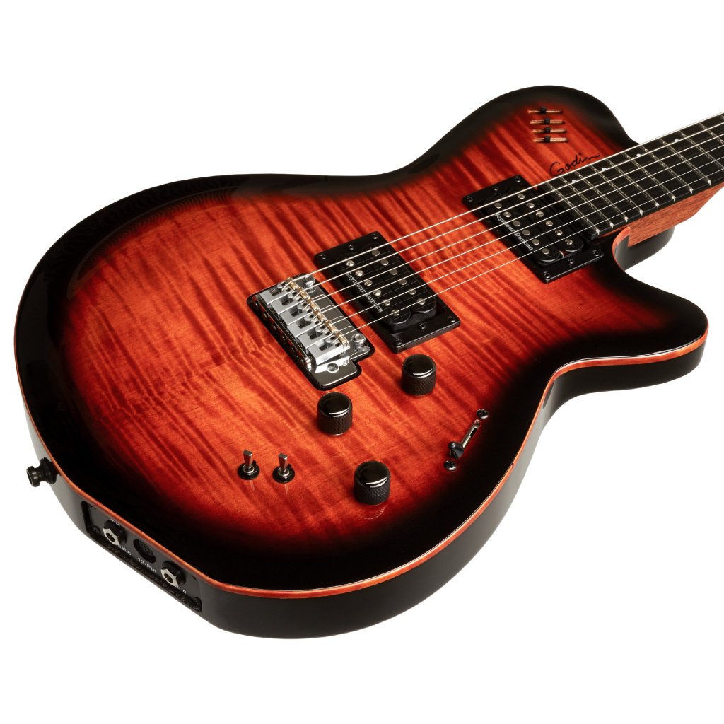 Elektrická hybridná midi gitara GODIN LGXT SA Cognac Burst Flame AA kombinuje dizajn s jedným výrezom a zvuk humbuckerov elektrických gitár Seymour Duncan s piezoelektrickými kameňmi akustických gitár LR Baggs. Vďaka 13-pinovému konektoru a špeciálnej elektronike RMC je navyše možné nástroj pripojiť k syntetizátorom Roland a skombinovať tak zvuky elektrických a akustických gitár so zvukmi syntetizátorov.