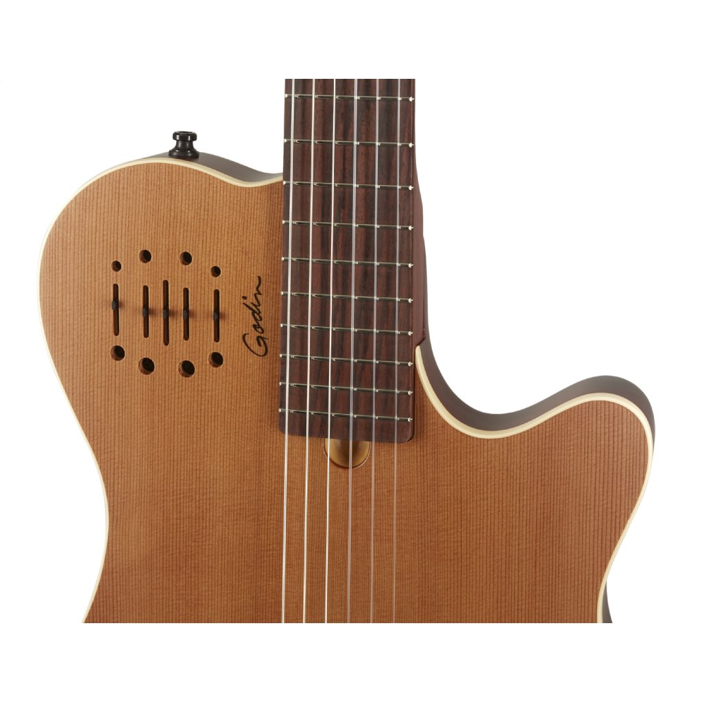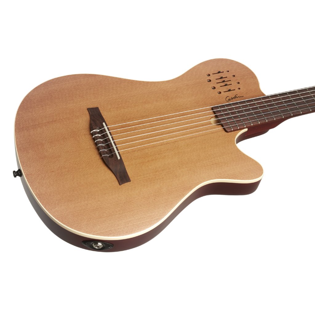 Nástroj je vybavený elektronikou Custom Godin Dual Source, ktorá ponúka duálne snímanie zvuku pomocou piezo snímača pod korpusom a ďalšieho snímača pod rezonančnou doskou. Charakter zvuku môžete upraviť pomocou ovládača hlasitosti, trojpásmového ekvalizéra a mixu (zmiešavania).