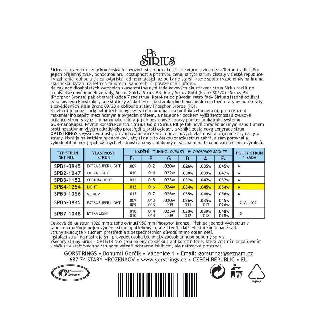 Struny SIRIUS majú na českom trhu dlhoročnú tradíciu a sú veľmi obľúbené najmä medzi trampmi a folkármi. Ich veľkým lákadlom je nielen priaznivá cena, ale aj príjemný zvuk a pohodlné hranie. Táto nová séria PB sa však od pôvodných Siriusov líši hneď v niekoľkých ohľadoch. Struny majú šesťhranné jadro vinuté obľúbeným fosforobronzovým materiálom, vďaka čomu majú guľatejší a uchu príjemnejší zvuk. Okrem toho sú potiahnuté špeciálnou antikoróznou vrstvou, ktorá výrazne predlžuje ich životnosť. Výsledkom je úplne nová generácia optistringov, ktorá vyniká brilantným teplým zvukom, vysokou odolnosťou a extrémne dlhou životnosťou.
