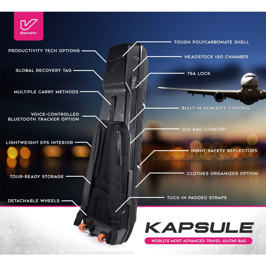 Kapsule je unikátny a revolučný obal pre akustické a elektrické strunové nástroje od firmy Gruv Gear a ponúka maximálne pohodlie pre váš nástroj a drobné príslušenstvo. Je vhodný predovšetkým pre muzikantov na cestách, ktorí vyžadujú maximálne bezpečie pre svoj nástroj, ale zároveň sa nechcú z trhu jeho nosením. Konštrukcia obalu tvorí kombinácia odolného polykarbonátu a ABS plastu, interiér je potom vyplnený mäkkou EPS penou, ktorá sa automaticky odvetráva, skvele ochráni váš nástroj a dokonale absorbuje vonkajšie otrasy či nárazmi. Jednoduchý transport vám potom zaručí odolná kolieska, robustný chrbtové popruhy s mäkkým polstrovaním a pár ručných madiel.