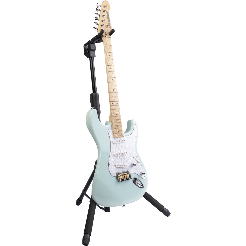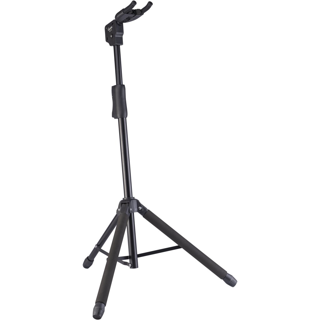 Univerzálny stojan na nástroje od čínskej spoločnosti Guitto umožňuje uložiť takmer všetky typy gitár a basgitár bez ohľadu na tvar hlavice. Jedinečný samosvorný mechanizmus spoľahlivo zaistí nástroj na mieste pomocou najjednoduchšieho princípu, na ktorý sa môžete vždy spoľahnúť - gravitácie. Pevná oceľová konštrukcia zaručuje nosnosť až 20 kilogramov, zatiaľ čo poddajný polyamid spoľahlivo zabráni poškriabaniu laku vášho cenného nástroja. Stojan sa dá samozrejme zložiť na jednoduchú prepravu alebo uskladnenie.