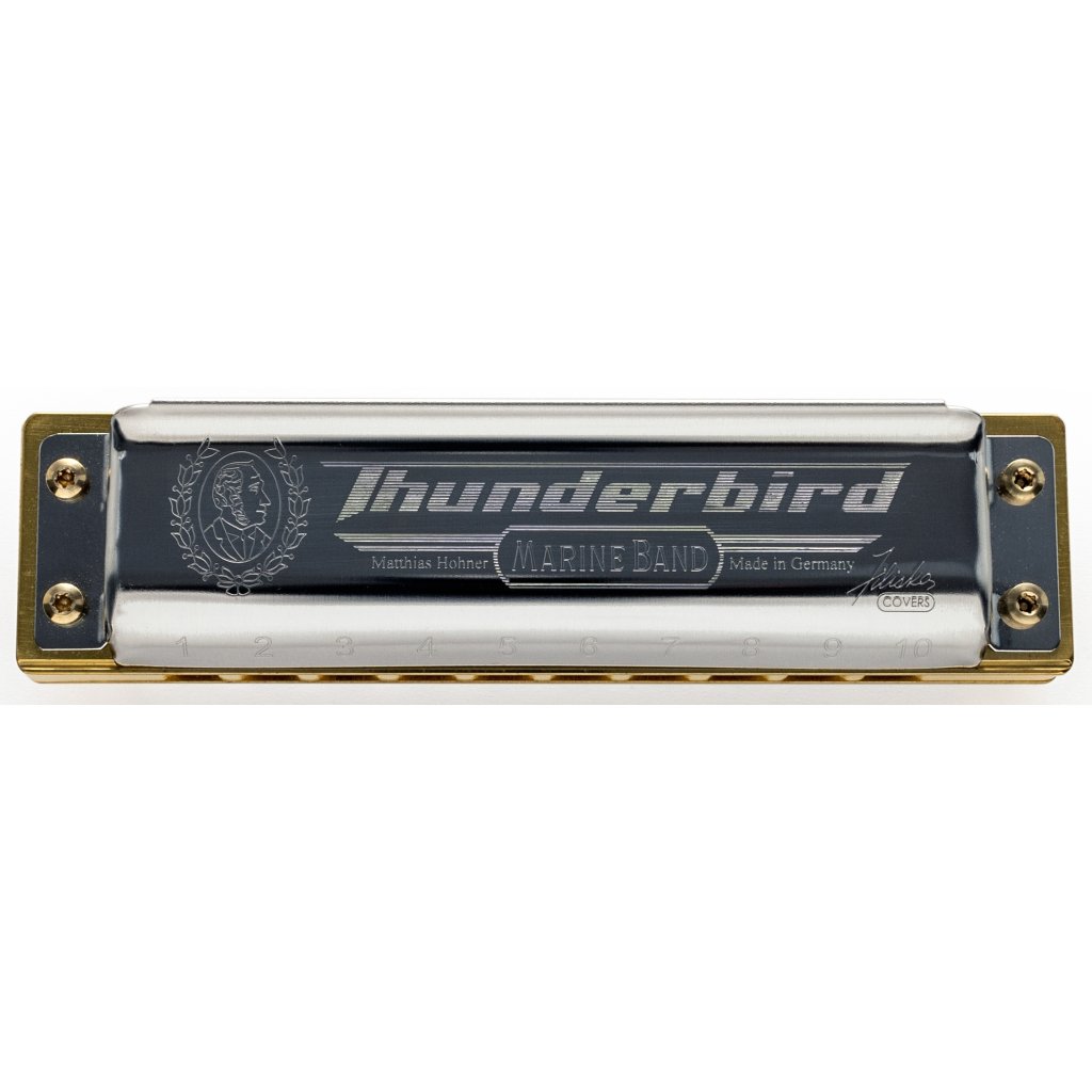 Model Marine Band Thunderbird je laděný o oktávu níže než standardní foukací harmoniky. Je tak schopen produkovat opravdu silný, bohatý zvuk s akcentovaným basovým rejstříkem. Jeho patentovaný, třikrát lakovaný korpus z laminovaného bambusu je zcela voděvzdorný a vzduchotěsný, což zaručuje jeho stálost, dlouhou životnost a jasný, znělý tón. Harmonika obsahuje mosazné hláskové desky o tloušťce 0,9 mm a je kryta ozvučnicí z nerezové oceli s bočními otvory a otevřenou zadní stranou. Spodní asymetrický kryt zabraňuje drnčení plátků při hře. Zvukově harmonika pokrývá celkem tři oktávy.