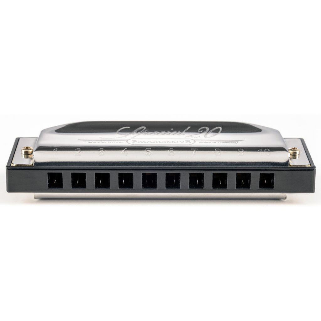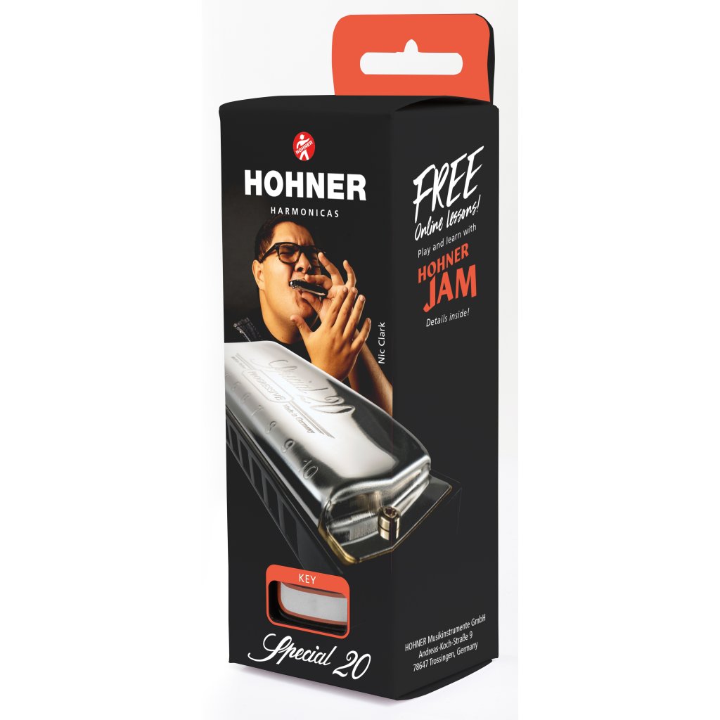 Model Special 20 je jedným z najuniverzálnejších modelov, ktoré nájdete v portfóliu značky Hohner. Je vhodná pre úplných začiatočníkov aj profesionálnych hráčov, má teplý, zvučný a príjemný zvuk, ktorý si nájde cestu do širokej škály žánrov. Vďaka skvelému zvuku a herným vlastnostiam si ho obľúbili aktívni hudobníci, ako napríklad John Popper z kapely Blues Traveler. Čierne telo harmoniky je vyrobené z odolného kompozitného materiálu ABS a je vybavené dvoma mosadznými ozvučnicami s hrúbkou 0,9 mm, rezonančná doska je z nerezovej ocele. Harmonika využíva Richterovo ladenie a jej rozsah dosahuje tri oktávy.