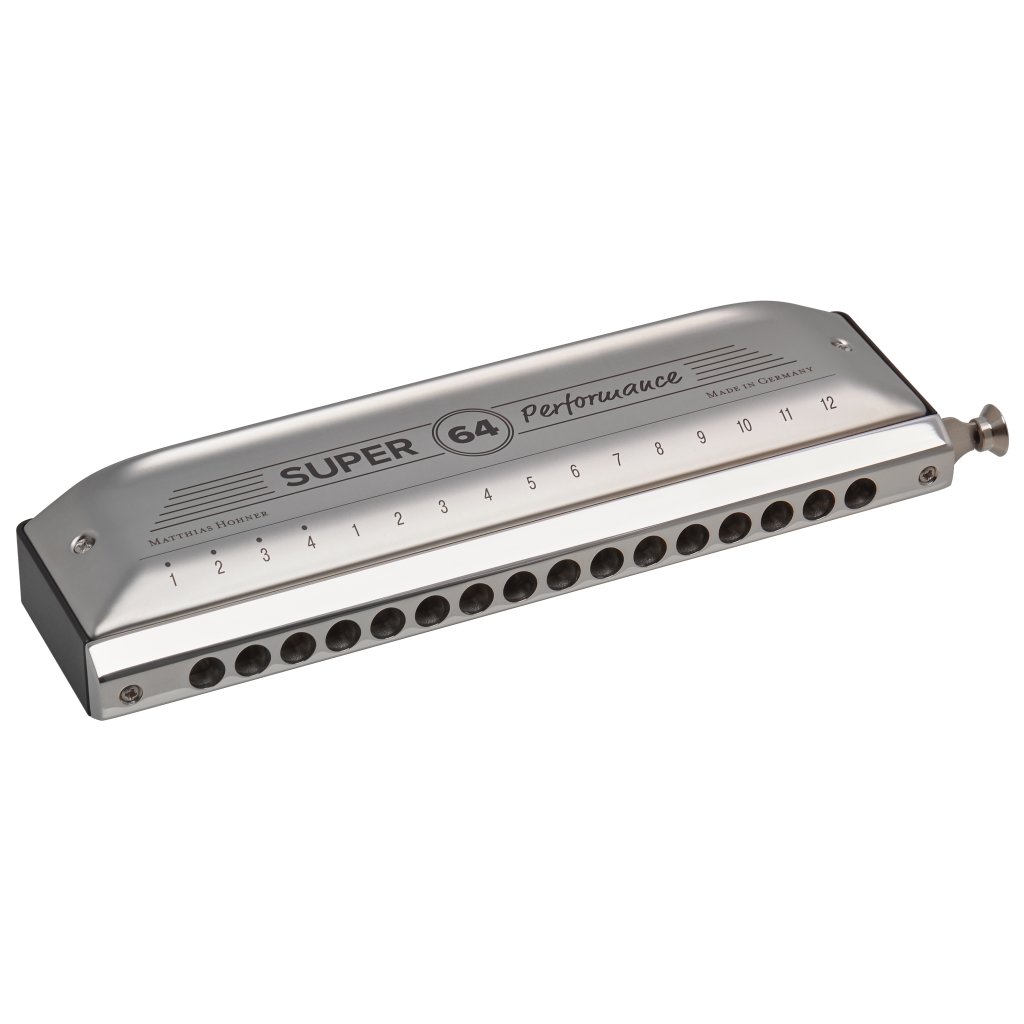 Chromatické harmoniky Super 64 zo série Performance sú určené pre pokročilých a profesionálnych hudobníkov. Nový model Super 64 pre rok 2018 ponúka najmä nové vylepšenia v podobe individuálneho nastavenia napätia pružinového posuvného mechanizmu, systém SilentSlide zaručuje absolútne tichú manipuláciu s posuvným mechanizmom a telesné kanály poskytujú mimoriadne rýchlu zvukovú odozvu. Okrem toho je harmonika vybavená čiernym kompozitným telom z ABS, náustkom z leštenej nehrdzavejúcej ocele, krytmi z nehrdzavejúcej ocele, šesťdesiatimi štyrmi mosadznými hlavami, mosadznými plátkami s hrúbkou 1,2 mm a rozsahom štyroch oktáv od hlbokej C3 po D7. Súčasťou balenia je robustné nylonové puzdro na zips.
