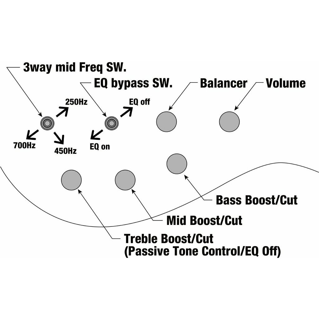 Na doladenie zvuku môžete použiť aktívnu elektroniku Ibanez Custom, ktorá je navrhnutá tak, aby poskytovala neuveriteľne širokú škálu zvukových možností, ako aj jednoduché ovládanie. Okrem tradičných ovládačov hlasitosti a vyváženia máte k dispozícii aj trojpásmový ekvalizér s nastaviteľnými stredovými frekvenciami, ktorý môžete zo signálnej cesty odstrániť pomocou miniprepínača.