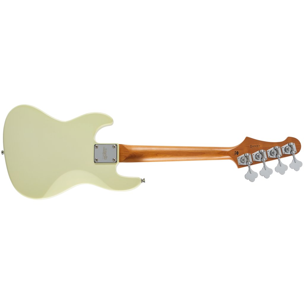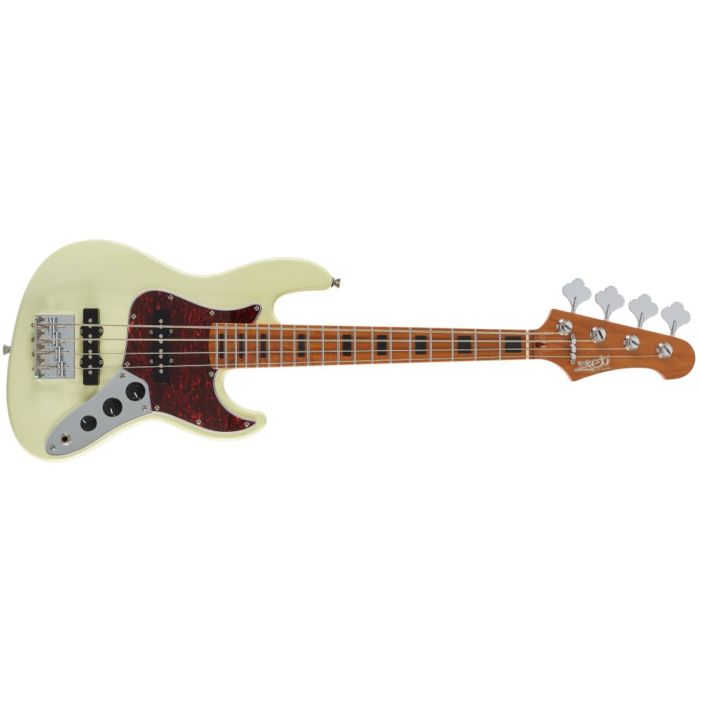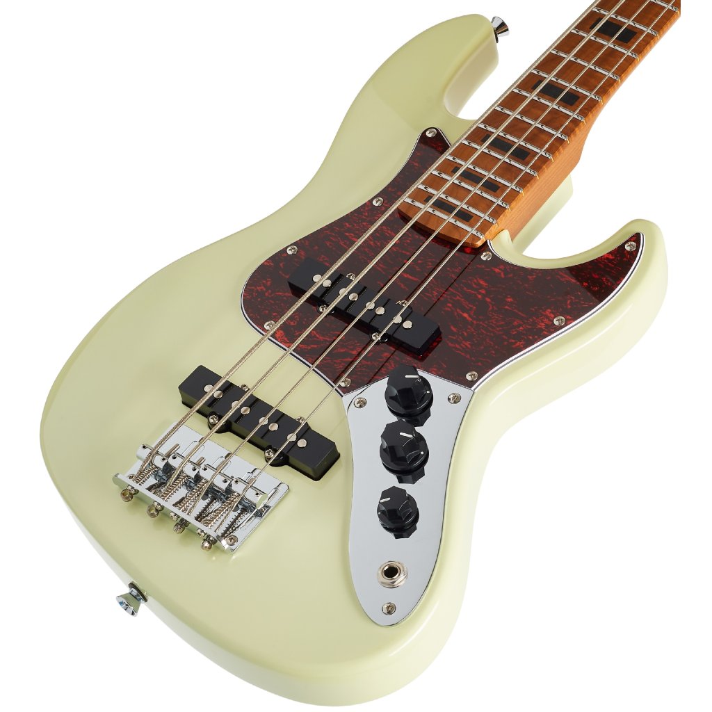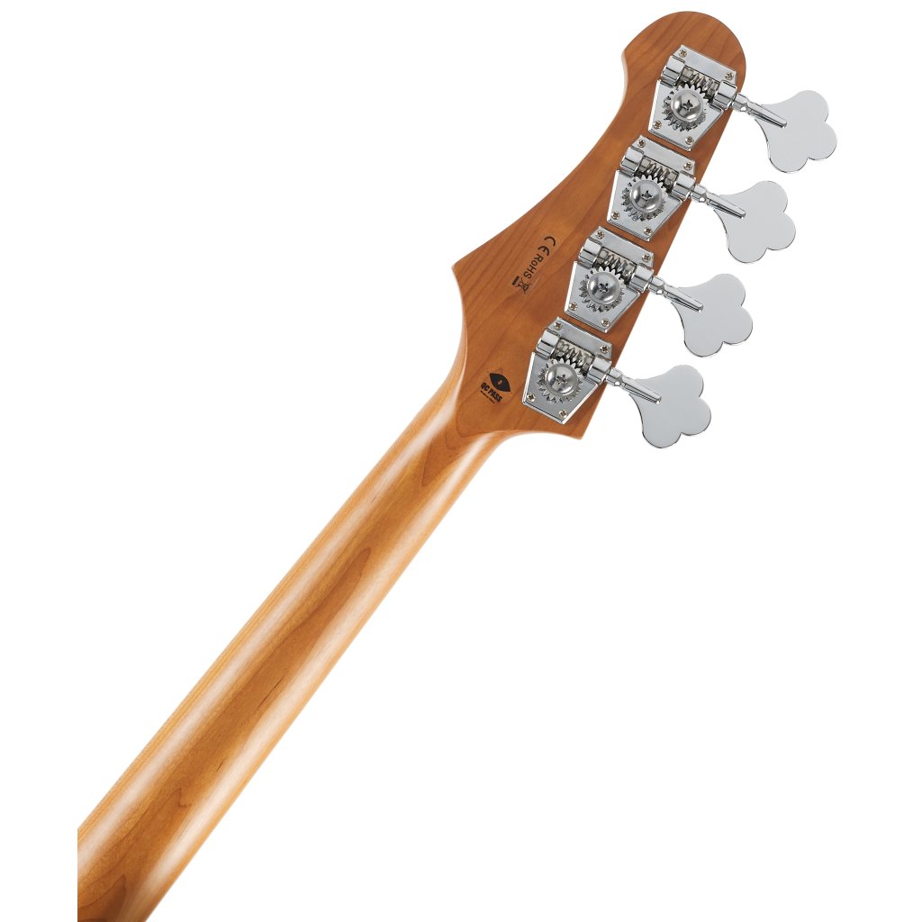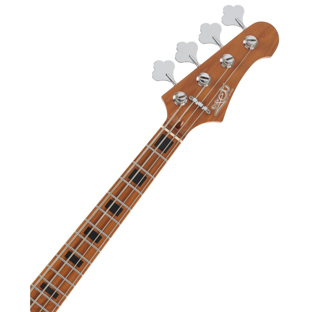 Baskytara je osazena dvěma JB style snímači. Charakter zvuku upravíte pomocí ovladačů hlasitosti snímačů a potenciometru tónové clony. Struny jsou uchyceny v chromovaných ladicích mechanikách ve vintage stylu a kobylce se čtyřmi sedly. Stylové zpracování podtrhuje pickguard z imitace želvoviny a firemní logo na hlavici.