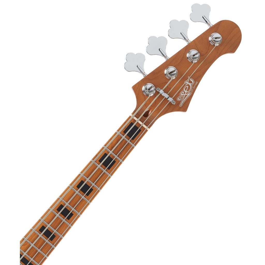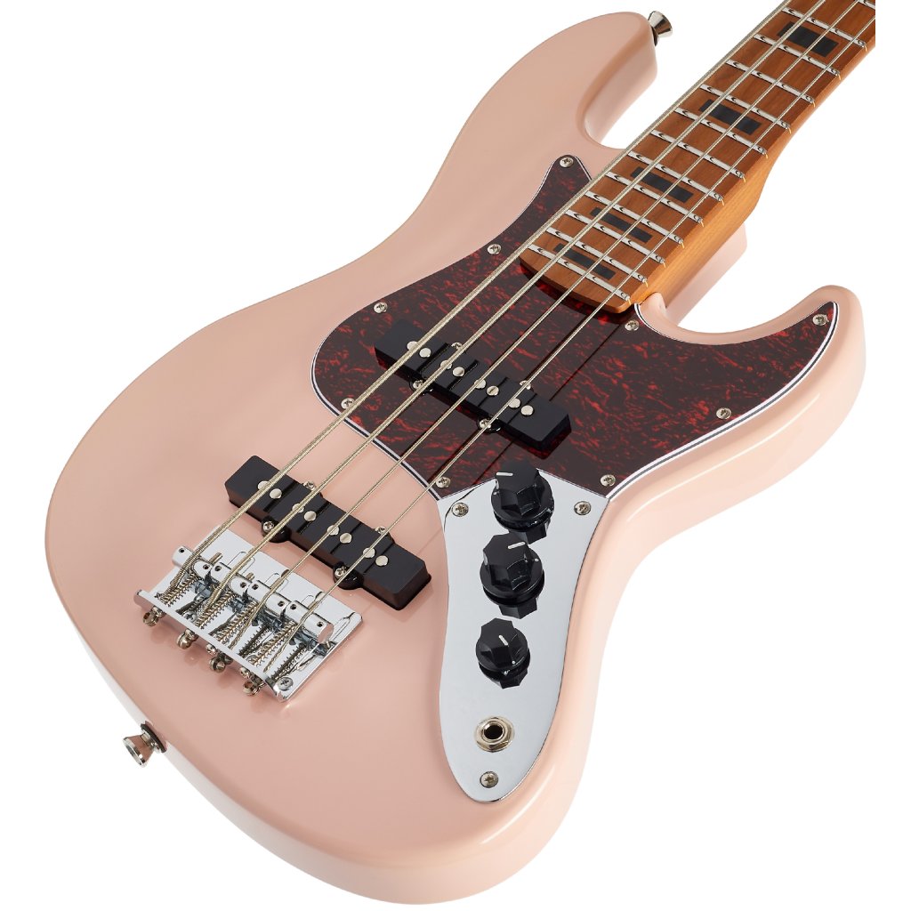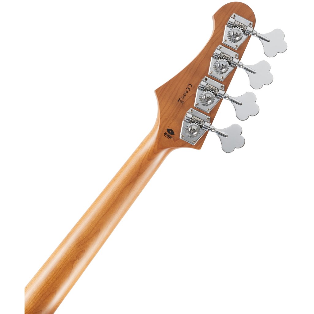 Baskytara je osazena dvěma JB style snímači. Charakter zvuku upravíte pomocí ovladačů hlasitosti snímačů a potenciometru tónové clony. Struny jsou uchyceny v chromovaných ladicích mechanikách ve vintage stylu a kobylce se čtyřmi sedly. Stylové zpracování podtrhuje pickguard z imitace želvoviny a firemní logo na hlavici.