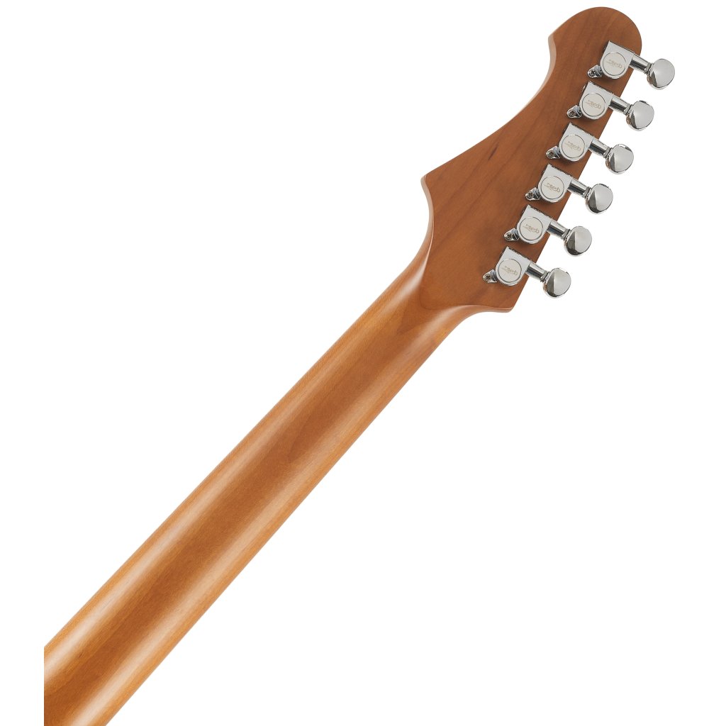 Tri single-coil snímače s keramickými magnetmi dodávajú gitare tradičný pocit a údernosť modelov ST. Charakter zvuku možno formovať pomocou potenciometrov hlasitosti, tónovej clony a päťpolohového prepínača snímačov. Struny sú ukotvené v chrómových ladiacich mechanikách a pevnom hmatníku - netreba deťom znepríjemňovať život tremolami. Pekné spracovanie podčiarkuje tradičný pickguard a logo Jet Guitars na hlavici.