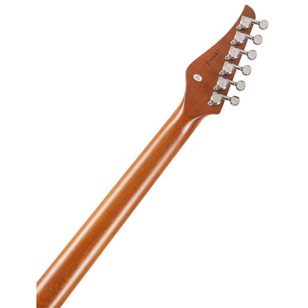 Jet JS-450Q TB R kombinuje prvky klasických modelov ST a modernejších modelov Super ST. Lipové telo nástroja zdobí efektná topoľová dýha so štruktúrou dreva podporená povrchovou úpravou Transparent Brown. Ku krku z kanadského tepelne upraveného (praženého) javora s profilom Modern C je prilepený palisandrový hmatník s dvadsiatimi dvoma pražcami.
