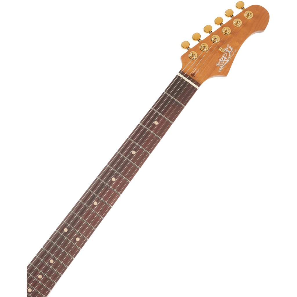 Lipové telo elektrickej gitary JET JS-480 VI G je pokryté lesklou lakovou povrchovou úpravou. K priskrutkovanému krku z kanadského javora je prilepený palisandrový hmatník s dvadsiatimi dvoma pražcami. Krk bol pred montážou tepelne upravený, vďaka čomu je drevo stabilnejšie a zároveň získava vzhľad/atmosféru krku/hmatníka, na ktorý sa hrá už roky.