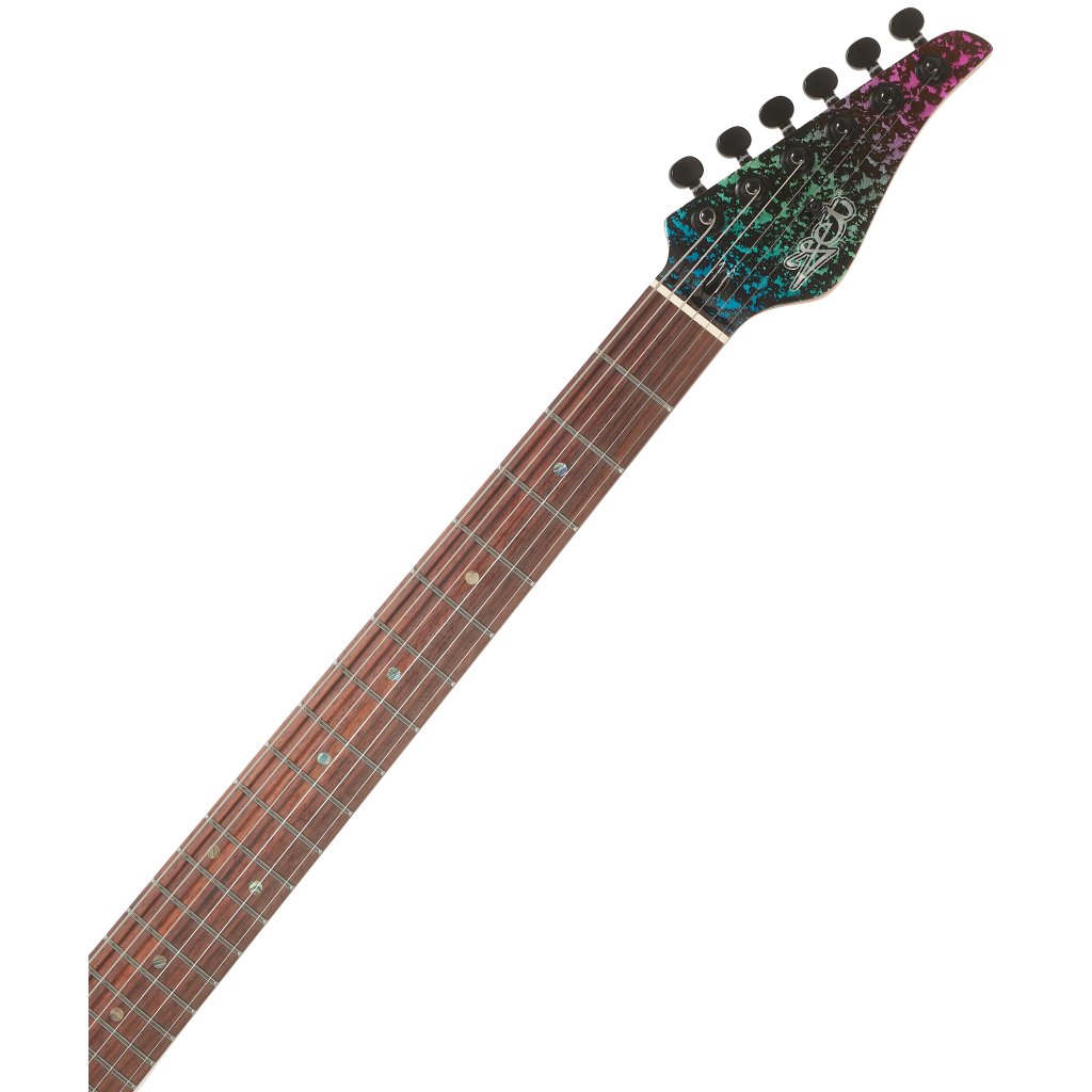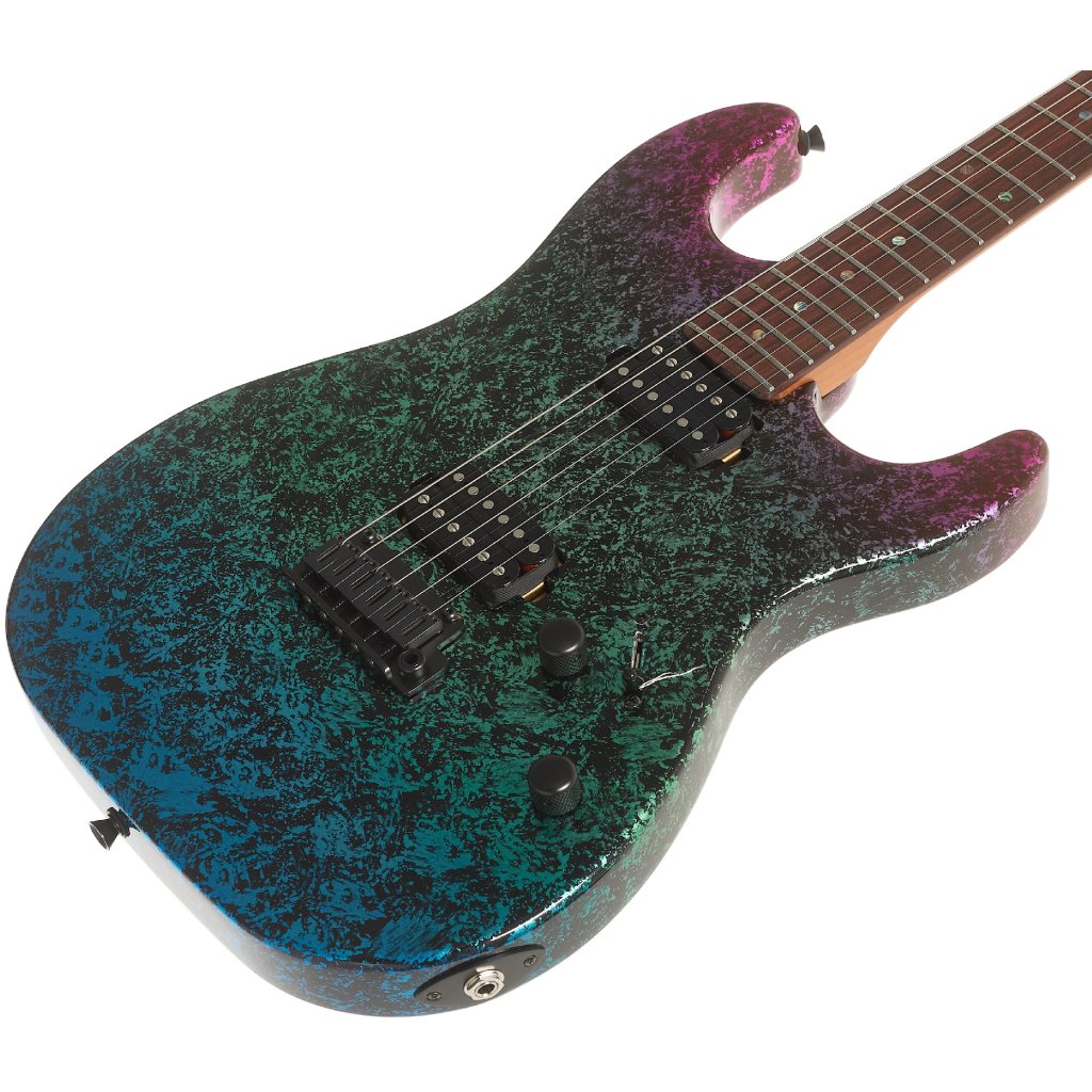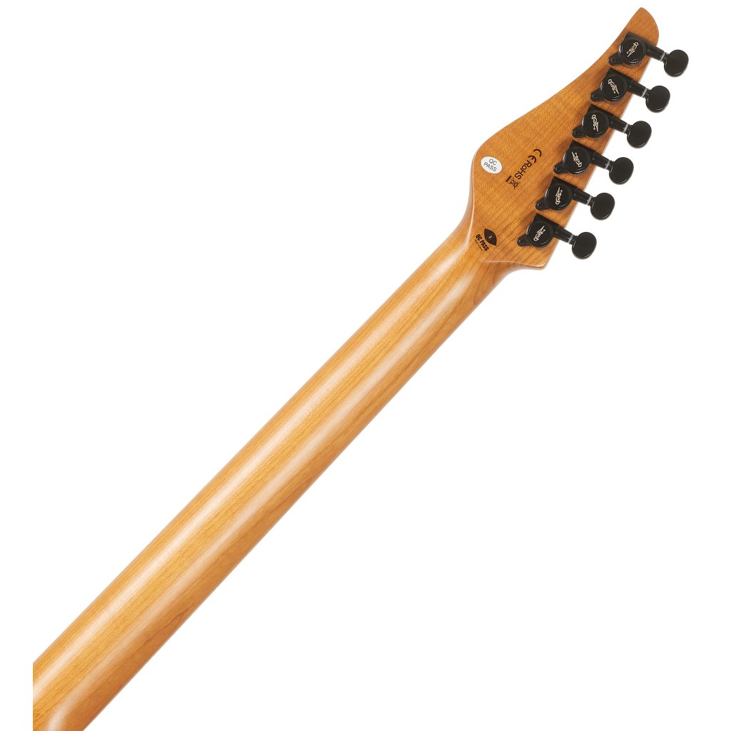 Dva na zákazku vinuté humbuckery s vysokým výstupným signálom (kýbel 20k Ohm) ponúkajú riadne horúci zvuk, ktorý oceníte v súčasnom rocku, metale a mnohých ďalších žánroch. Charakter zvuku upravíte pomocou ovládačov hlasitosti a tónovej clony a trojpolohového prepínača snímačov. Struny držia v uzamykateľných ladiacich mechanikách a jednootáčkovom tremole.
