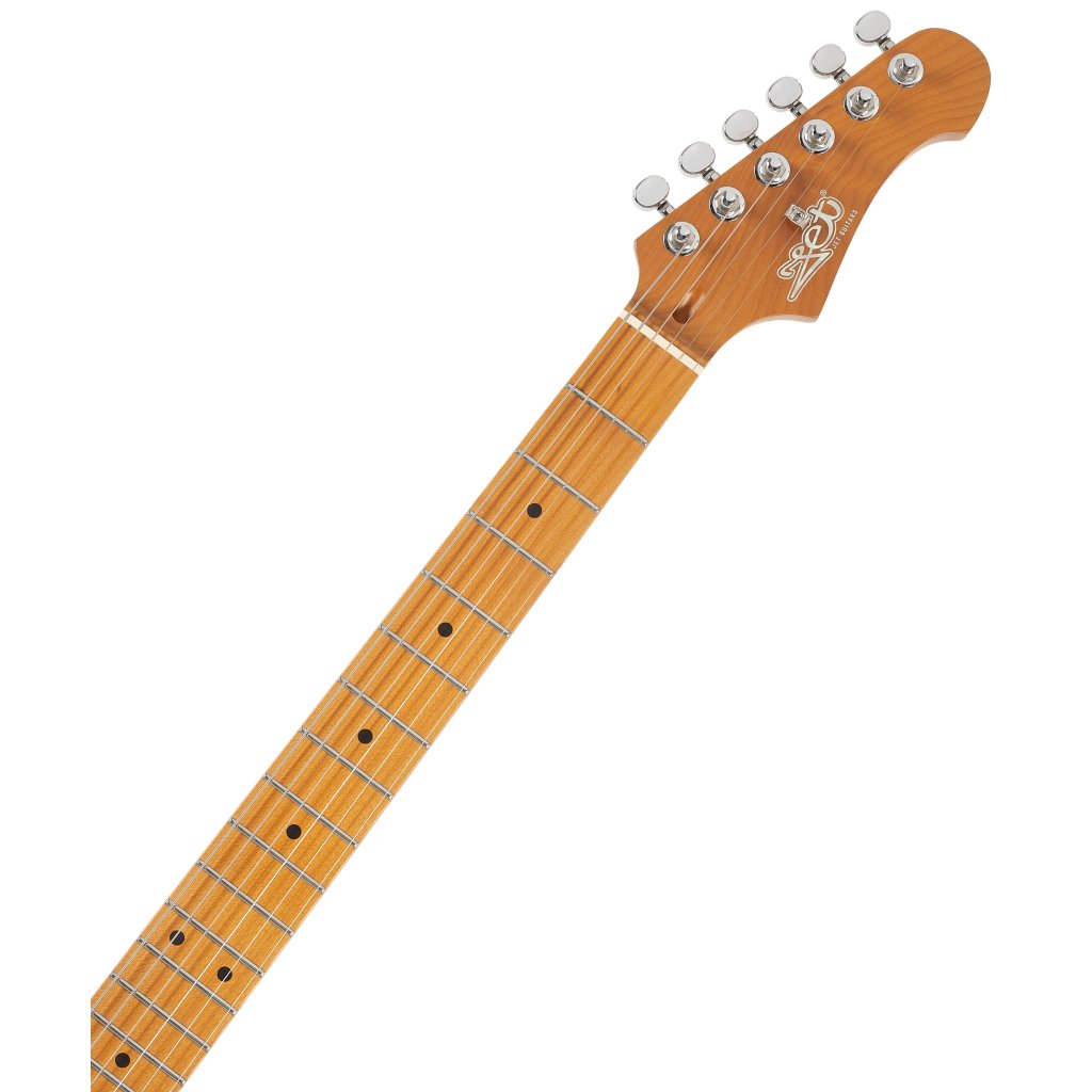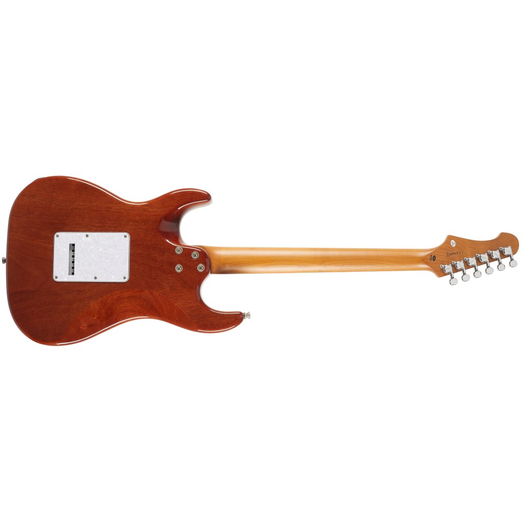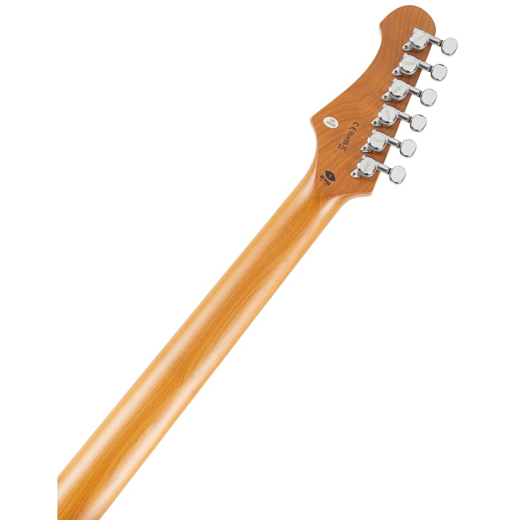 Elektrická gitara JET JS-600 TGR je modernejší model ST/Super ST. Mahagónové telo nástroja zdobí efektná dyha z dyhovaného javora. Na skrutkovaný krk z kanadského javora je prilepený javorový hmatník s dvadsiatimi dvoma pražcami. Vďaka tepelnej úprave krku a hmatníka je drevo stabilnejšie a zároveň gitara získava príjemne zlatistý vzhľad.