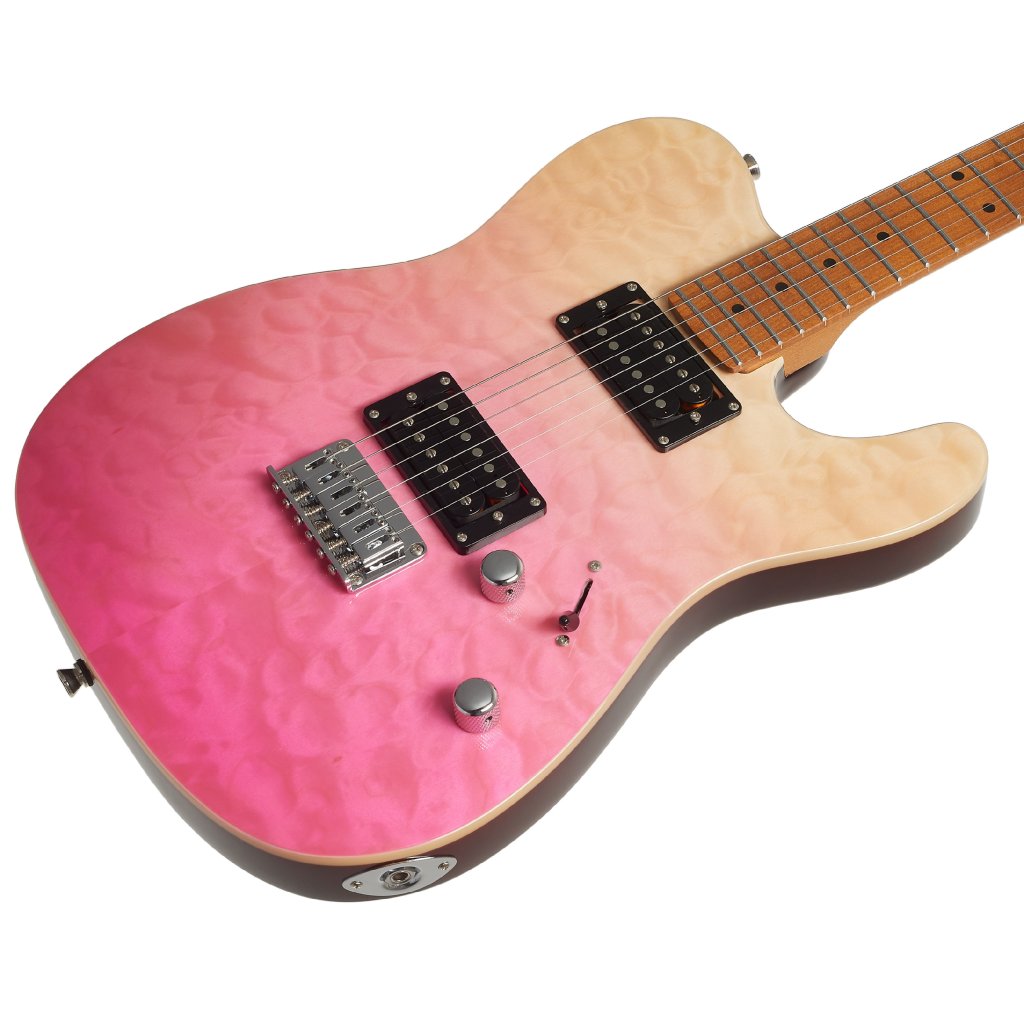 Elektrická gitara Jet JT-450 QTPK je modernejší model T. Lipové telo nástroja zdobí fládrovaná javorová dýha s kresbou dreva zvýraznenou povrchovou úpravou Quilted Transparent Pink. Skrutkovaný krk a hmatník z kanadského javora boli pred montážou tepelne upravené, vďaka čomu je drevo stabilnejšie a zároveň získava vzhľad/atmosféru krku/hmatníka, na ktorý sa hrá už roky.